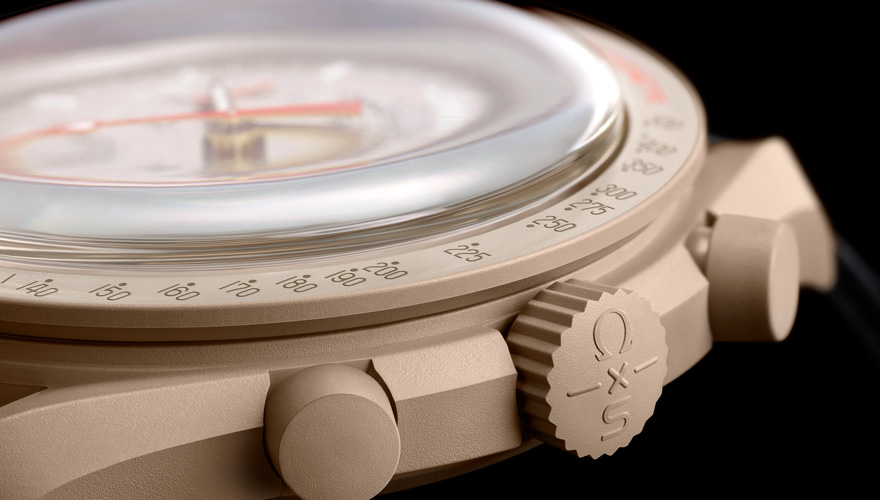 全モデルはバイオセラミック製で、3分の2がセラミック、3分の1がヒマシ油を原料にした混合素材を使用。ピンクやペールブルーなどのカラーを採用しているため、馴染みのあるスピードマスターではないが、ムーンウォッチの熱狂的なファンであれば、盛り込まれた主要なデザインの特徴に気づくはずだ。