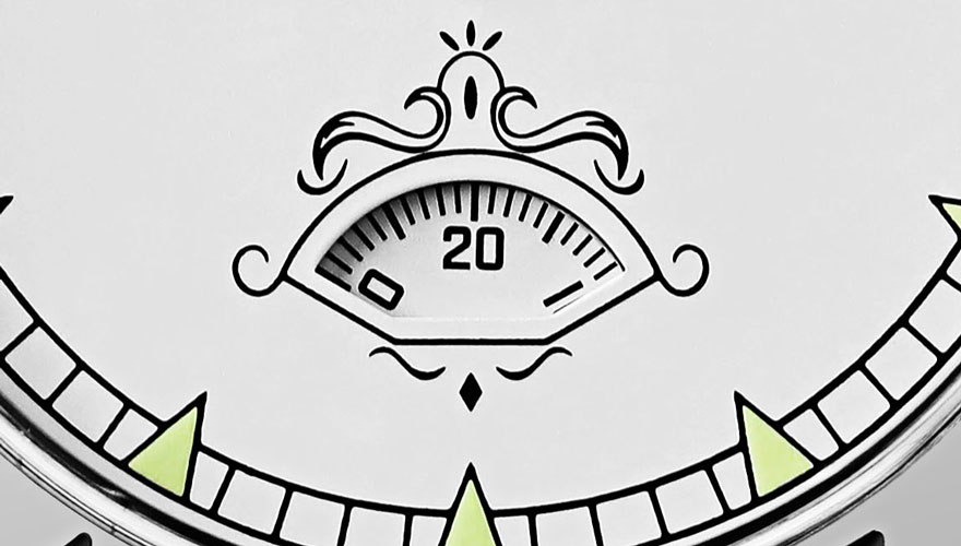 角張った幾何学的デザイン。精密さと大胆さ。退廃的な雰囲気を漂わせるディテールワーク。三角形の文字盤インデックス、ベゼルにシャープに刻まれた視認性の高いアラビア数字、ひし型の時針と分針など、全体にアールデコ調が際立っている。文字盤外周の分目盛りには線路を象ったレールウェイ目盛りを採用し、6時位置のスモールセコンド・ディスクのインジケーターの周りにはシンプルな装飾が施された。