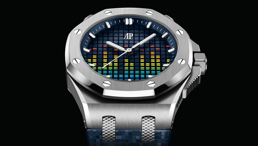 新しいロイヤル オーク オフショアはオーデマ ピゲと音楽の長い友情関係を祝したデザインを採用。イコライザーのモチーフの「タペストリー」ダイヤル、ジャックホールを思わせる溝入りのプロット、ミキサーのフェーダーを思わせるリューズガードが特徴である。自動巻きモデルで時・分・秒表示、6 時/12 時方向にカーブしたサファイアガラスを使い、幅広の面取りが多く見られる。ポップでカラフルなスタイルだが、頑丈でエレガント、洗練されたプレシャスな感覚が光る逸品だ。
