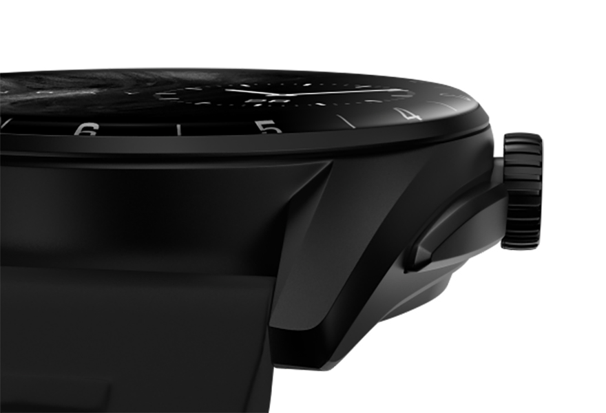 コネクテッドウォッチとしては小径な42mmのケースには、ブラックDLC加工を施したグレード2チタンが採用されている。各機能へのアクセスを司るリュウズとプッシャーは、ステンレススティール製だ。