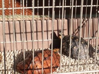 話を聞くと、ミドリガメ(名前は、イトー)とゼニガメ(名前は、ヨーカドー)を、幅30cmくらいのプラケースに入れて飼育しているようです。