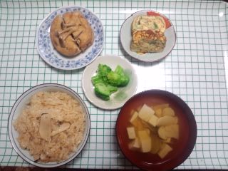 他は、昨夜の残りの松茸のお吸い物、ブロッコリーのお浸し、がんもどきの煮物、ポテトサラダです。
