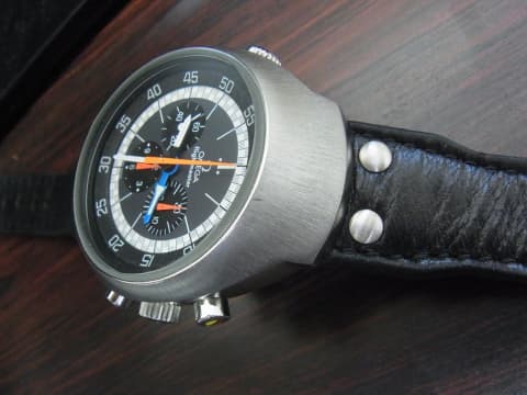 クロノグラフのスタート・ストップボタンには黄色とオレンジが塗装され、