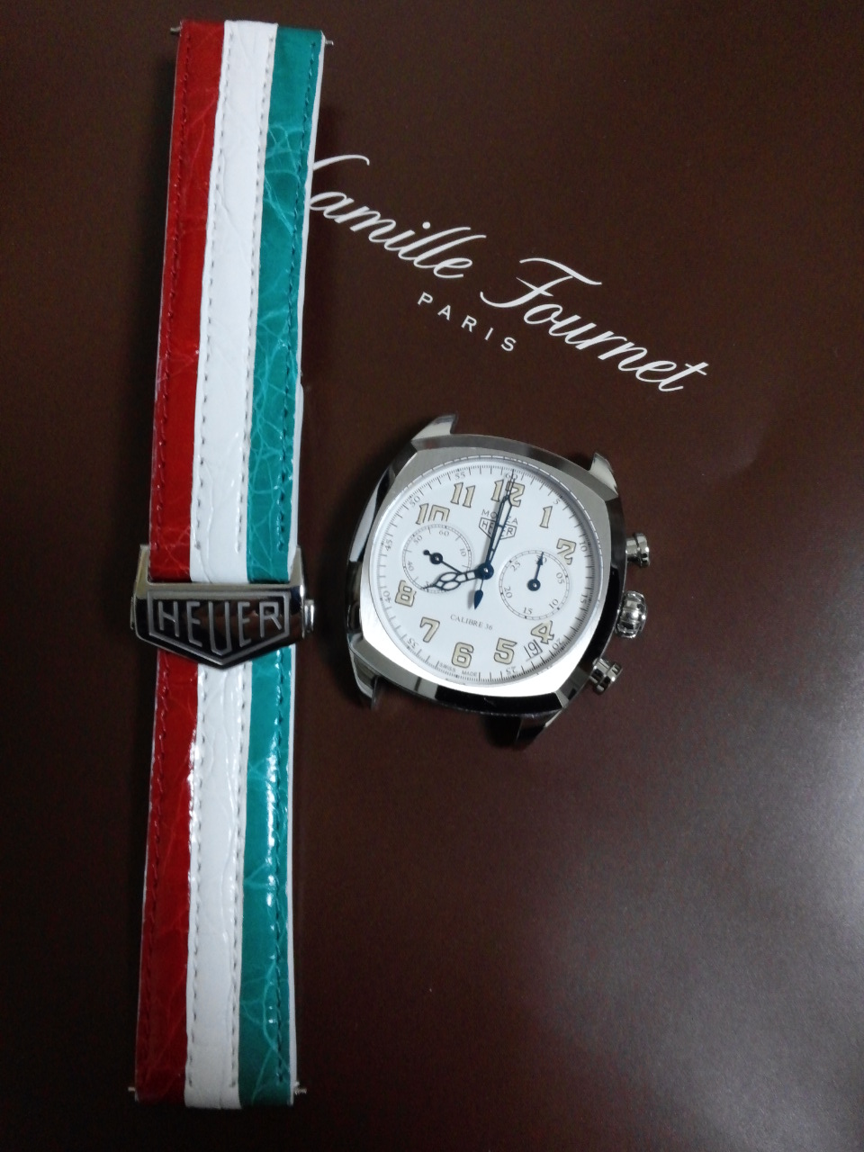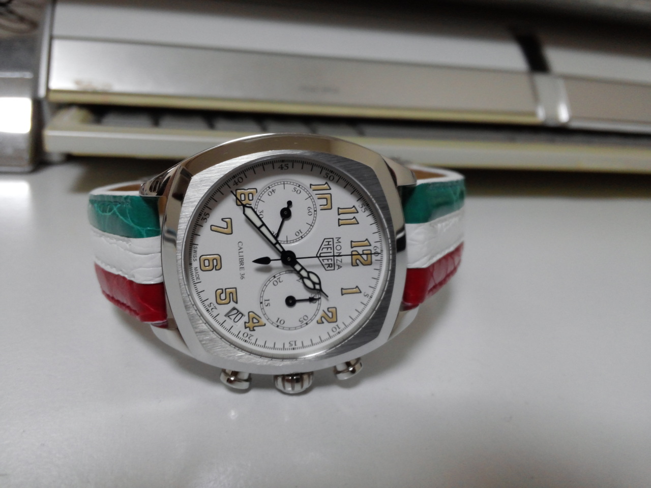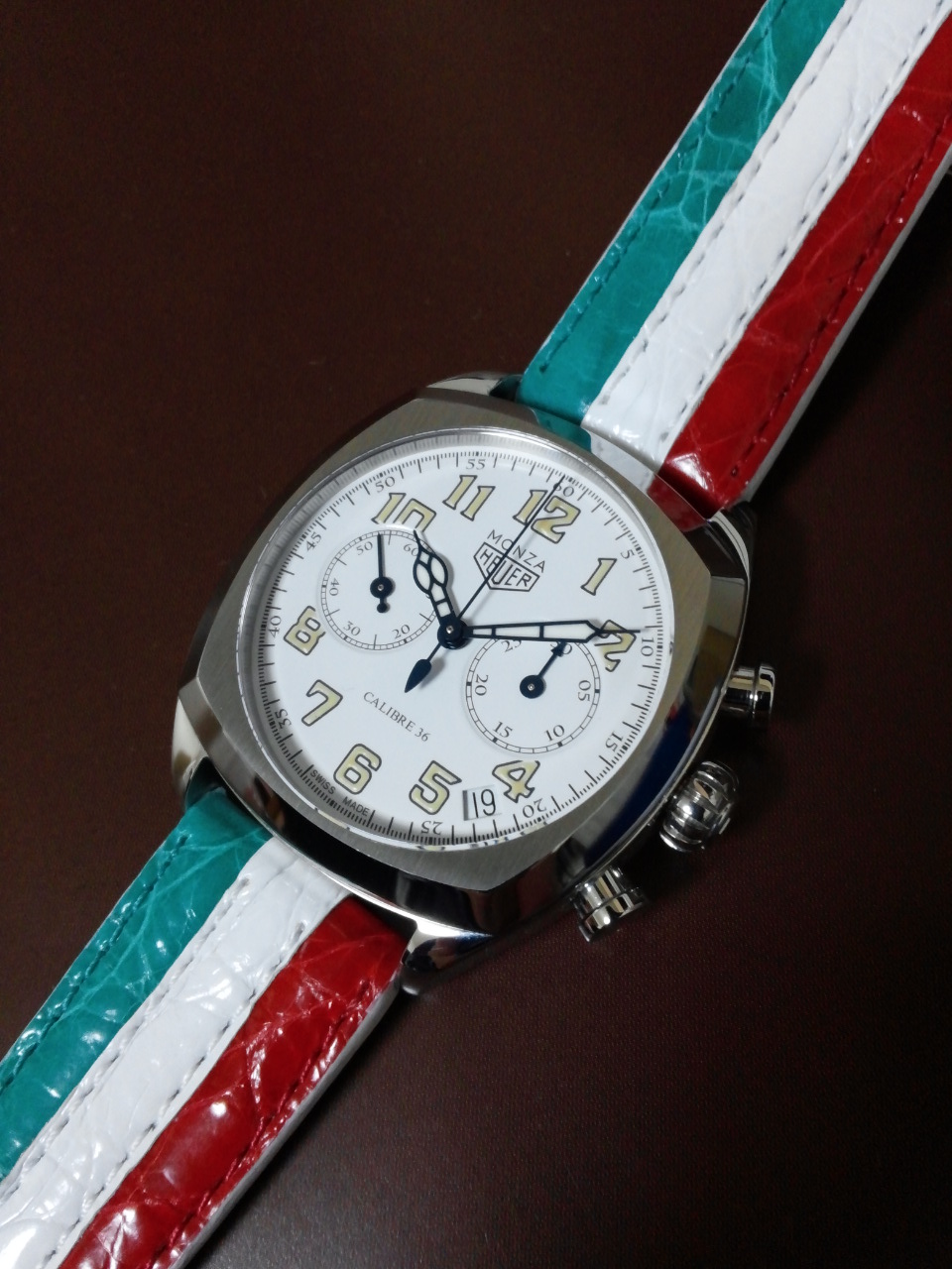 特注のイタリアントリコロール・クロコダイル革ベルトを付けています。
