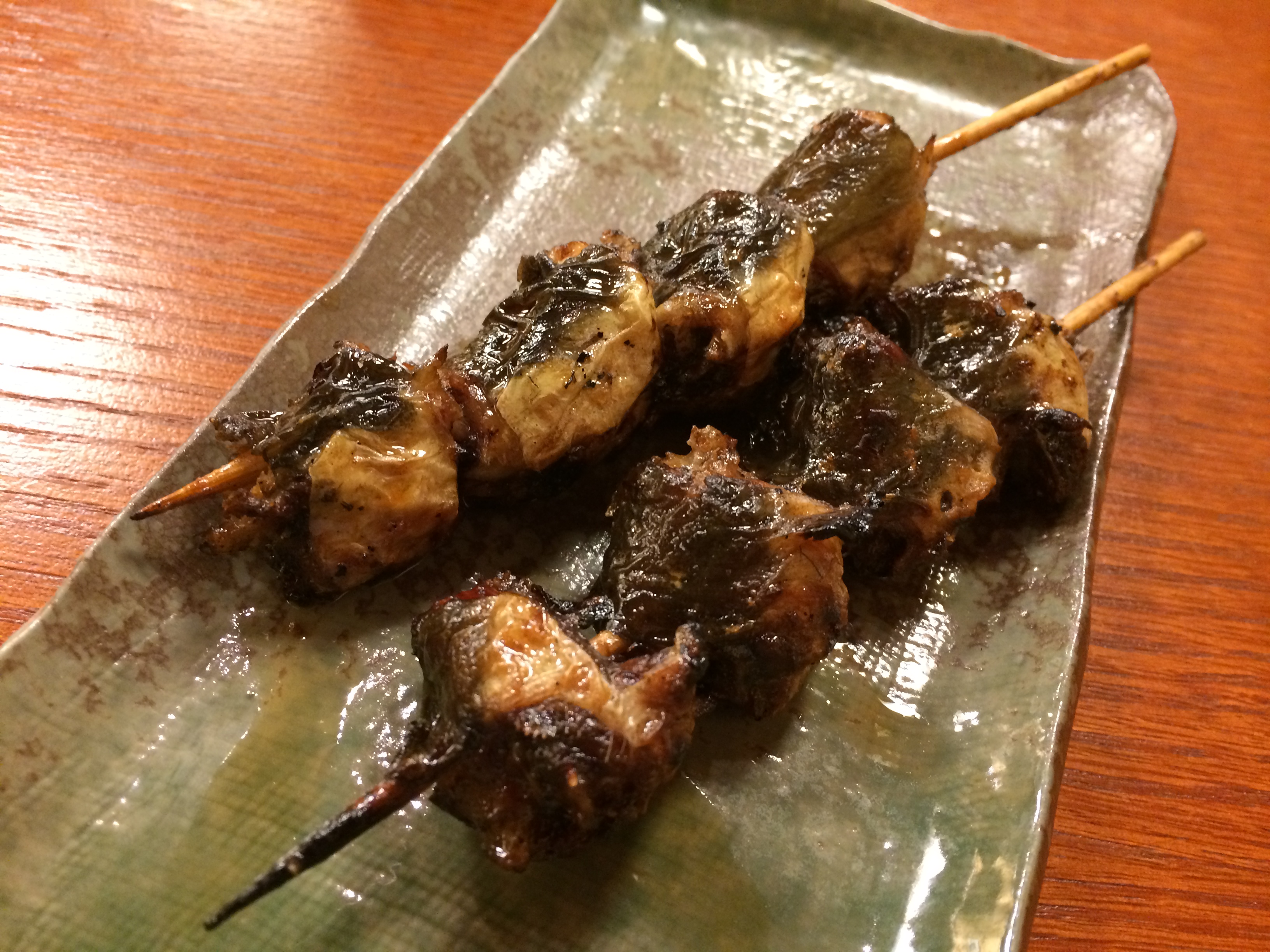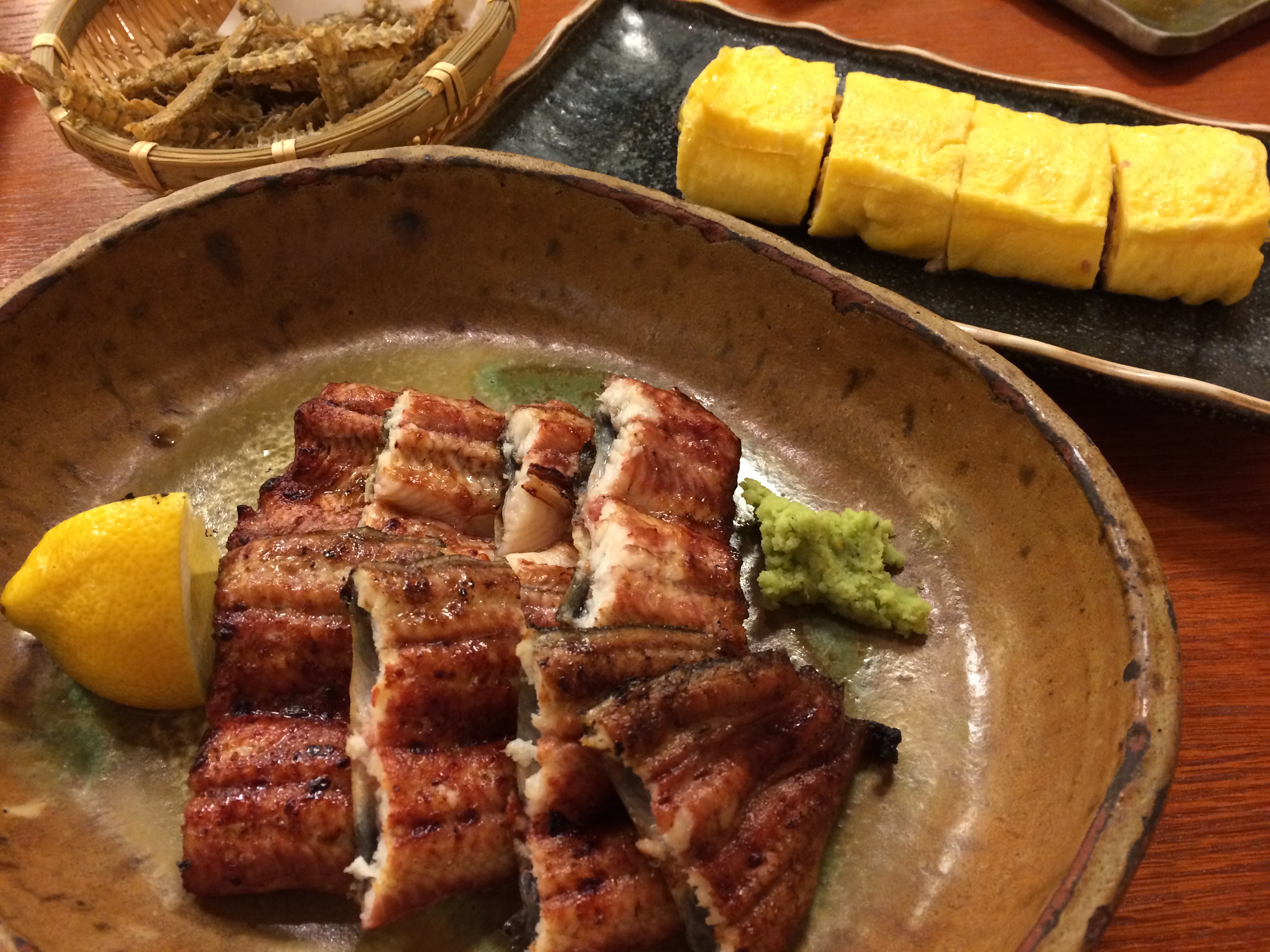 画像は 「白焼き・うまき・骨せんべい」、他に鰻のいろんな部位を串焼きで9種。