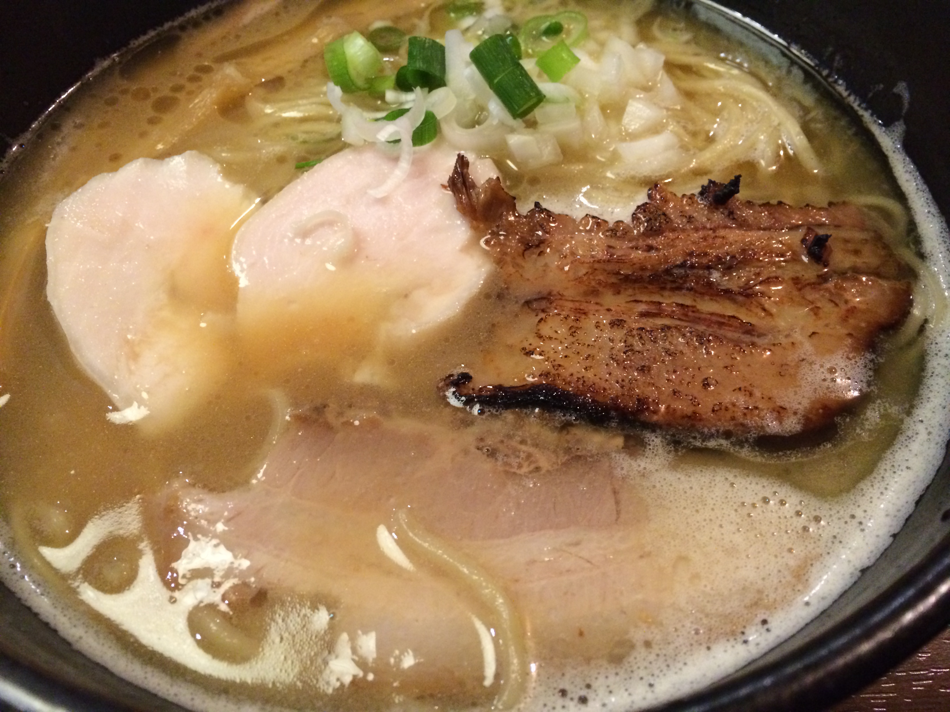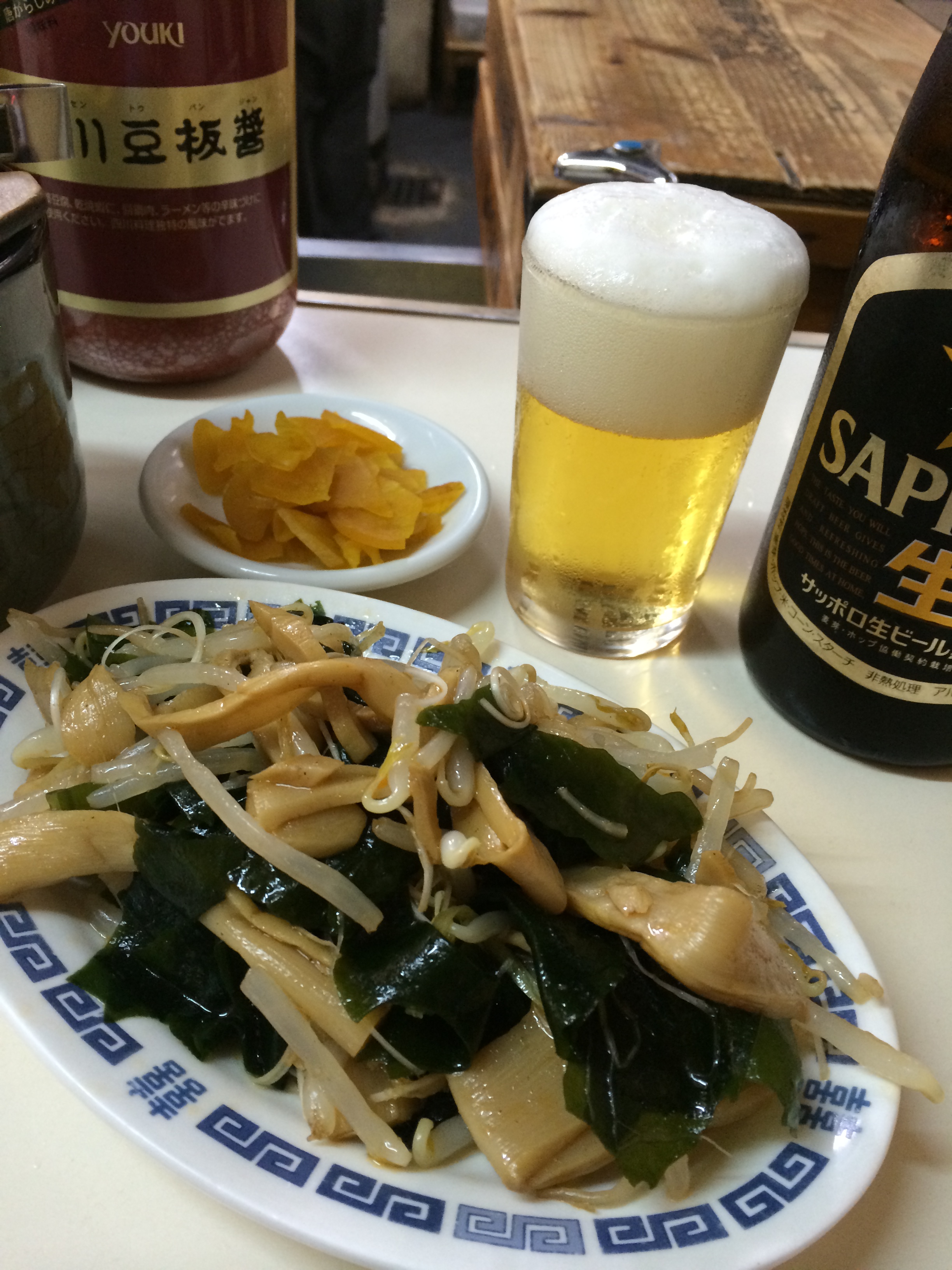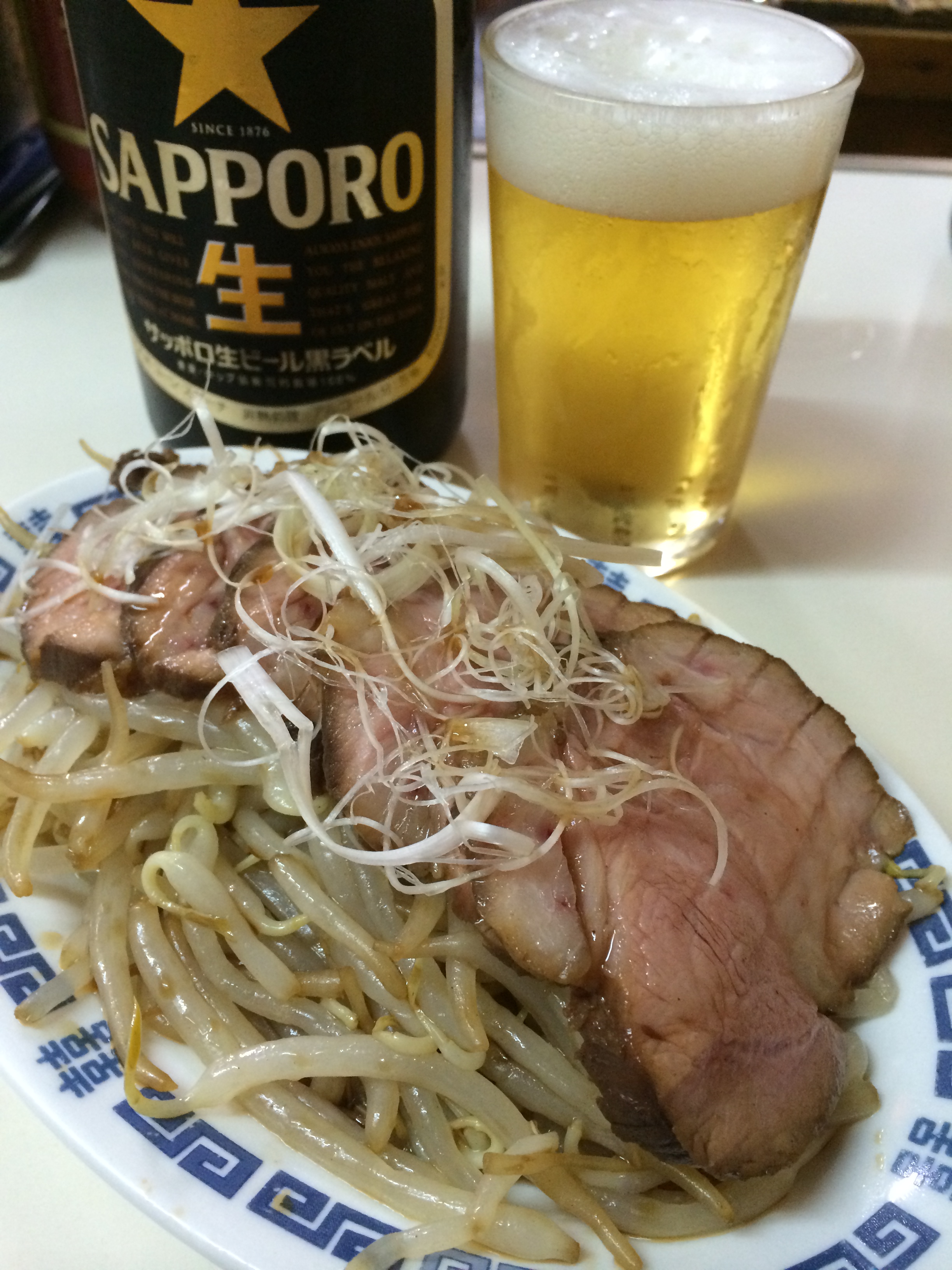 たっぷりのもやしの上に、ローストビーフのように中心がレアに近いチャーシューが5切れ。税込金400円であります。