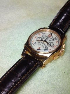 先日、ブログに書いたロジェのバイレトログラードクロノのベルトですが、焦げ茶に金茶か何かの明るい茶系のダブルステッチにしようと思います。