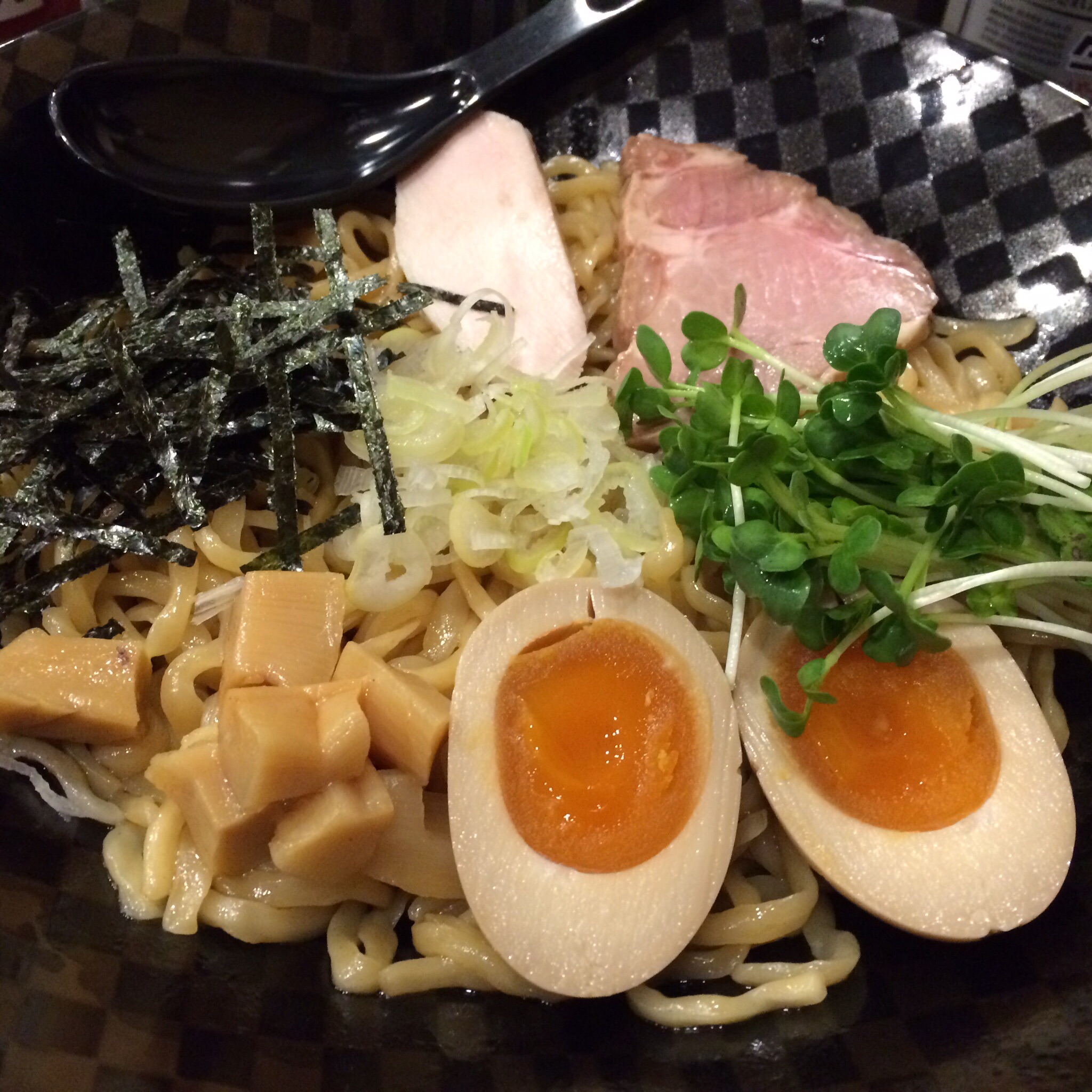 注文は、味玉OILそば大盛り、2種類のチャーシューと極太メンマをキューブ状にカットしたものなどが載っています。