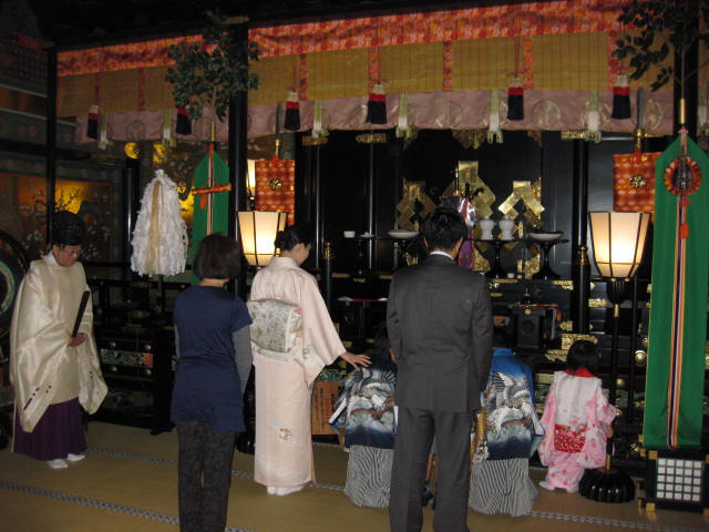 神殿で並んでいると子供3人着物を着ているのが珍しいようで、