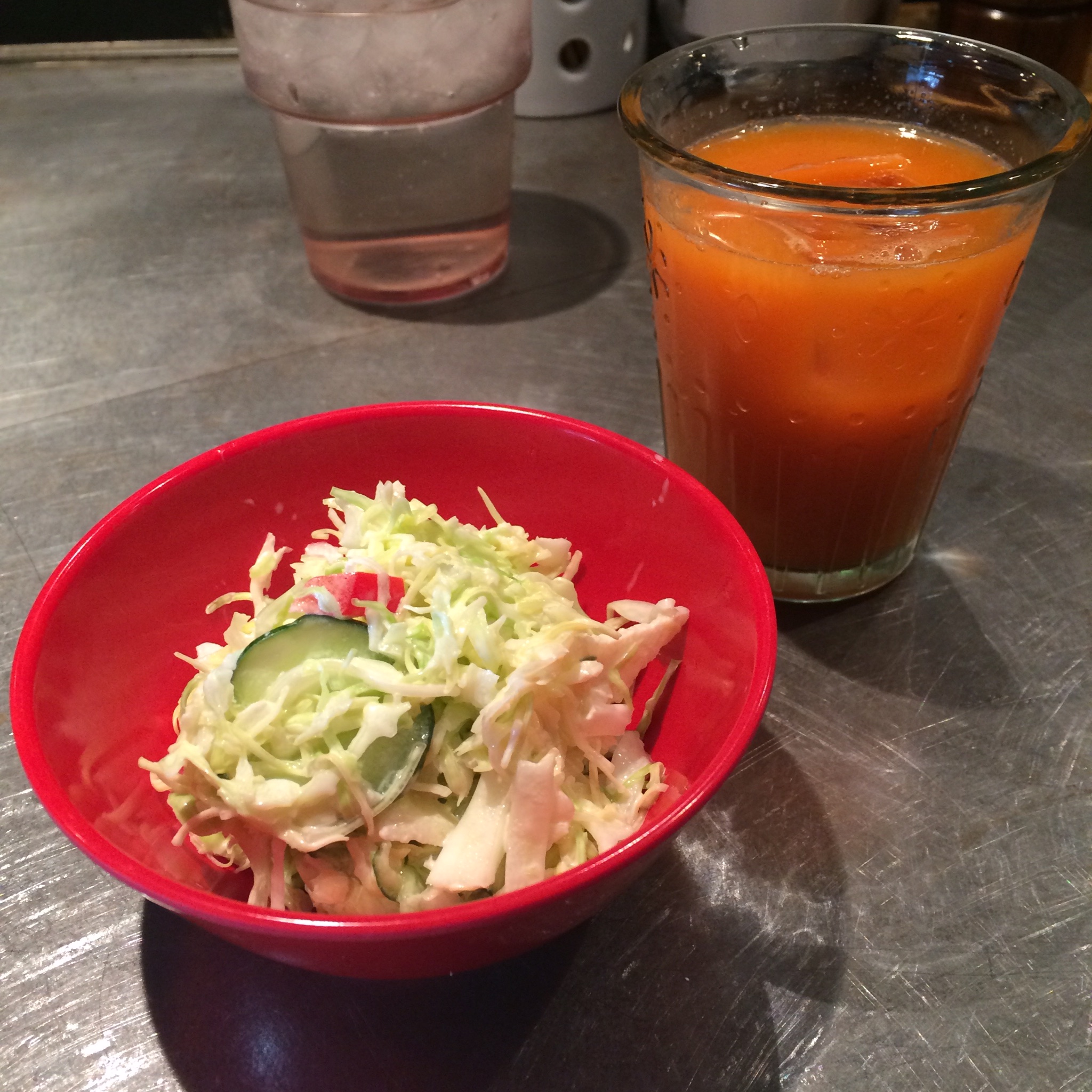 各100円也の「食べる野菜」と「飲む野菜」でつなぎ、麺の茹であがりを待ちます。