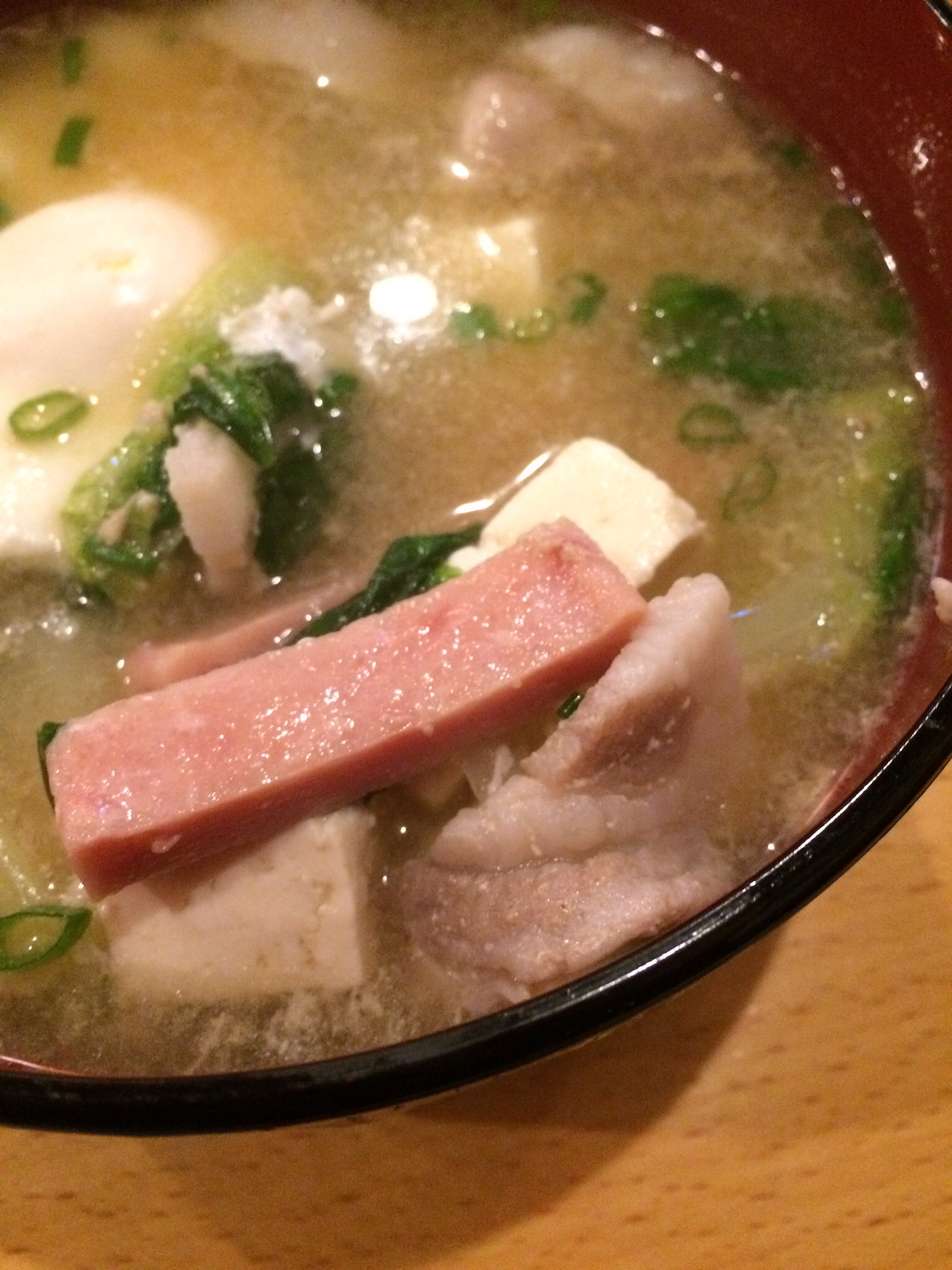 鰹出汁が利いています、スパムにスーチカが入ってるのね。