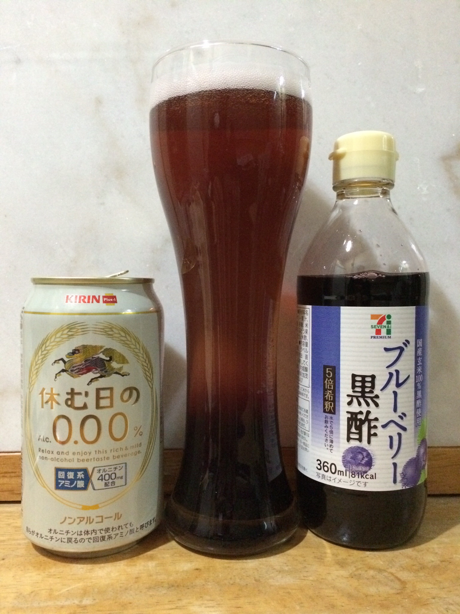 早速ブルーベリーの方をこれまたけんこうのため、オルニチン入りノンアルコールビール風飲料で割って飲みます
