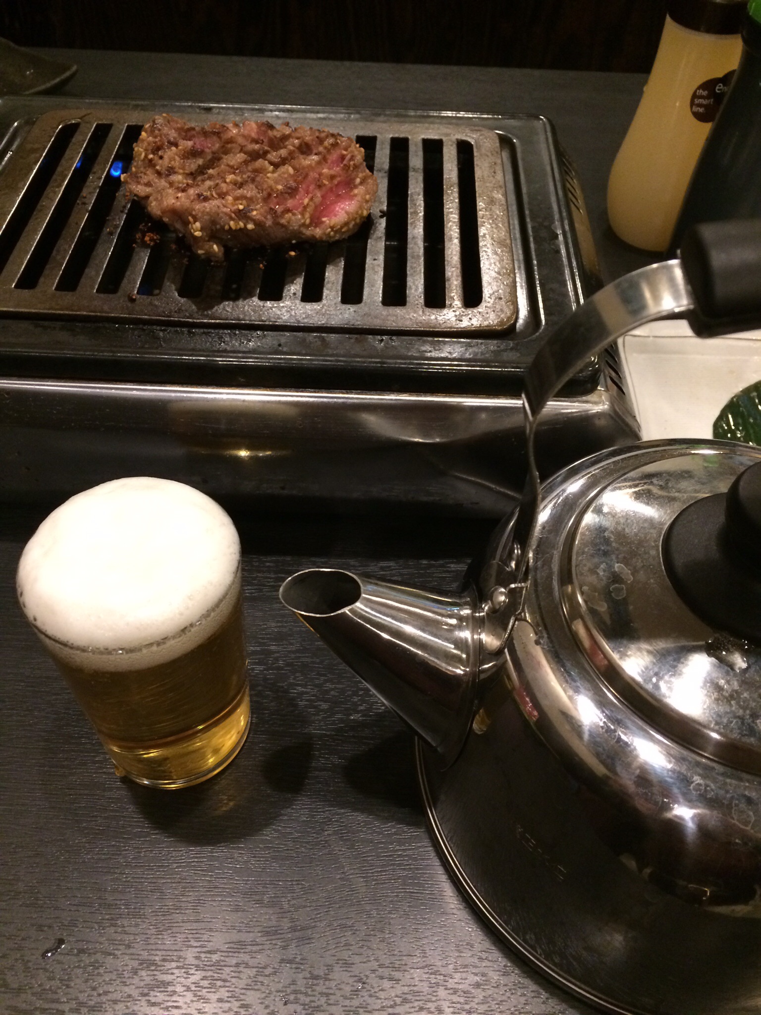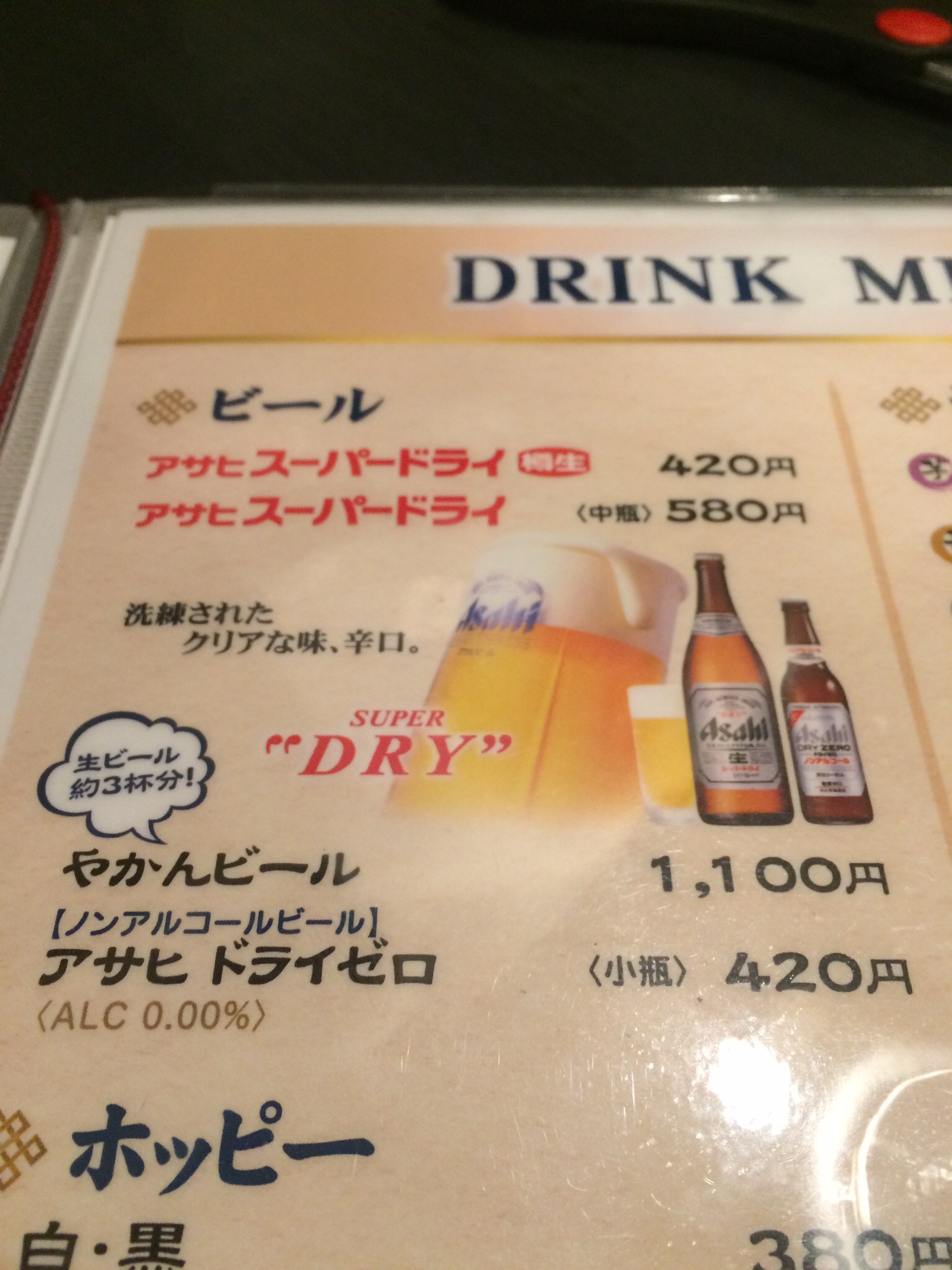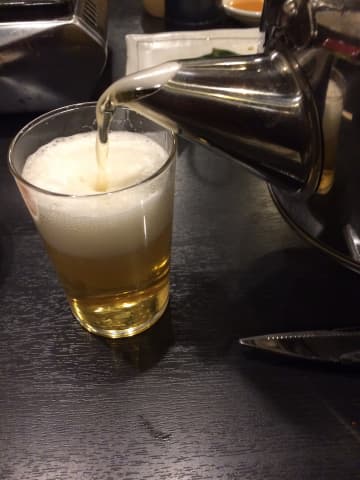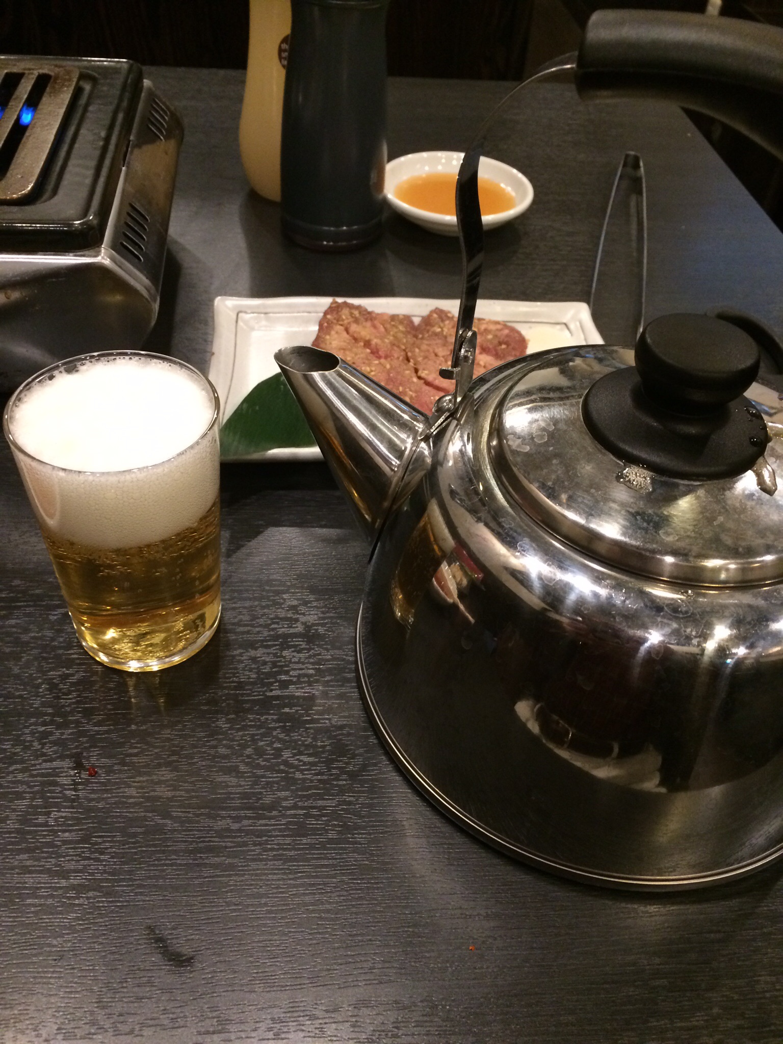 何にも出てこないうちに中生を飲み干して、「オービンとか大ジョッキないの〜っ」と聞いたら大きいジョッキは無いけど「やかんビール」ならありますとのこと。
