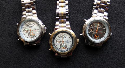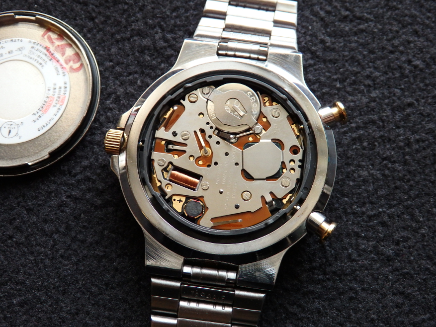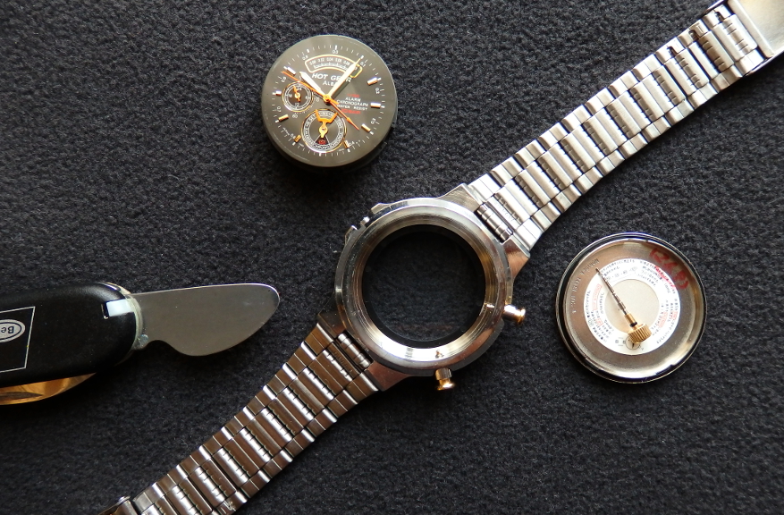 入れ替えたのは、部品取り用含め3本持っているシルバー文字盤とコンビケースのダーク文字盤の1/100秒計測、超ハイテク多機能グルグル時計です。