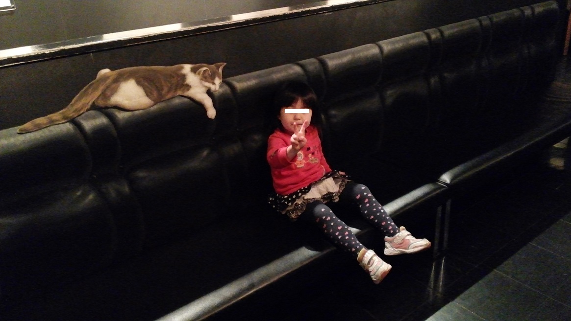 2枚目画像、床の一本橋も3枚目画像子供の座っているベンチの背もたれや猫も絵で書かれたものです。