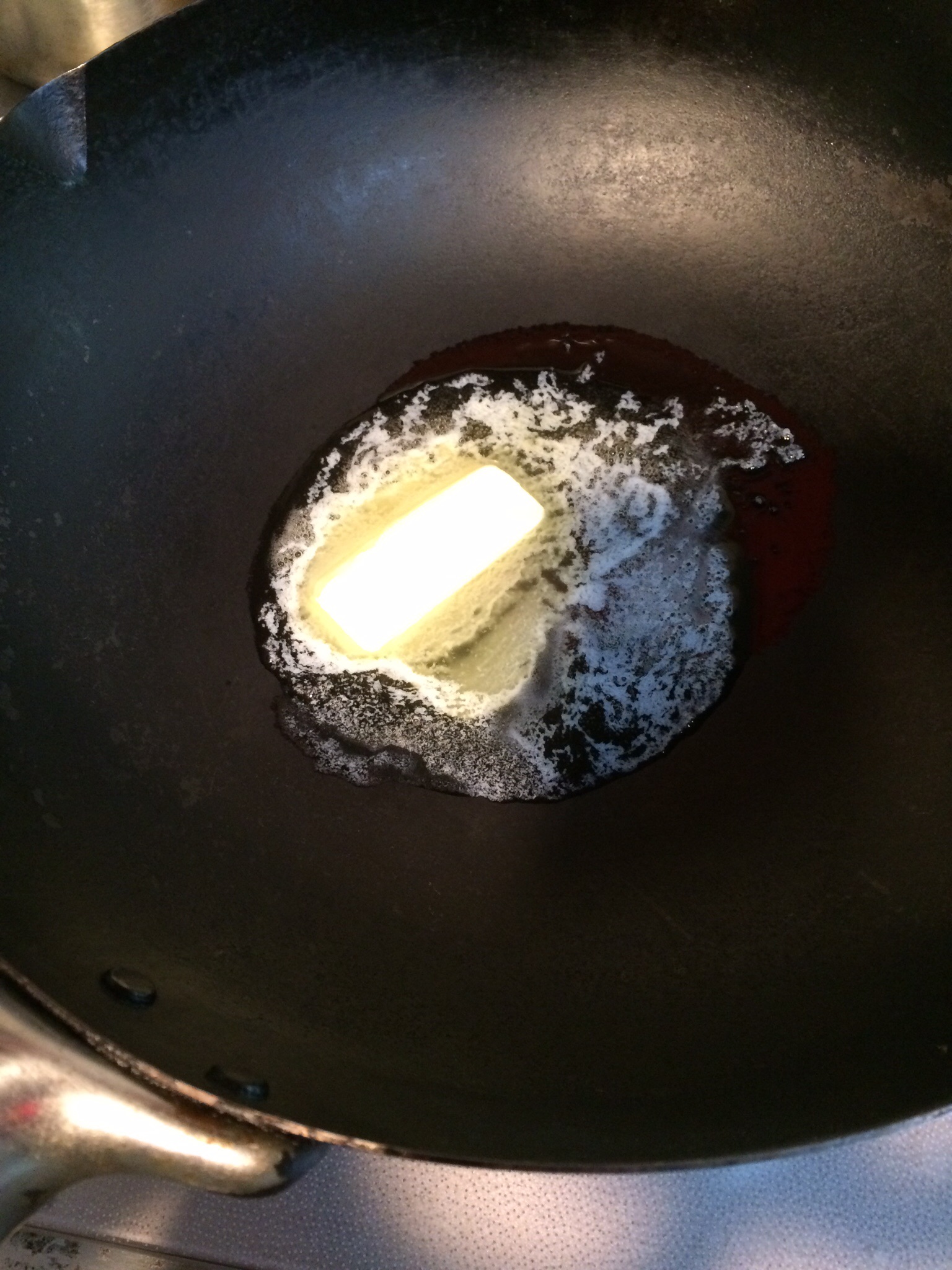 合わせは普通フライパンで行いますが、自宅では廻りに飛び散ってヒンシュクをかわぬように中華鍋を使います。