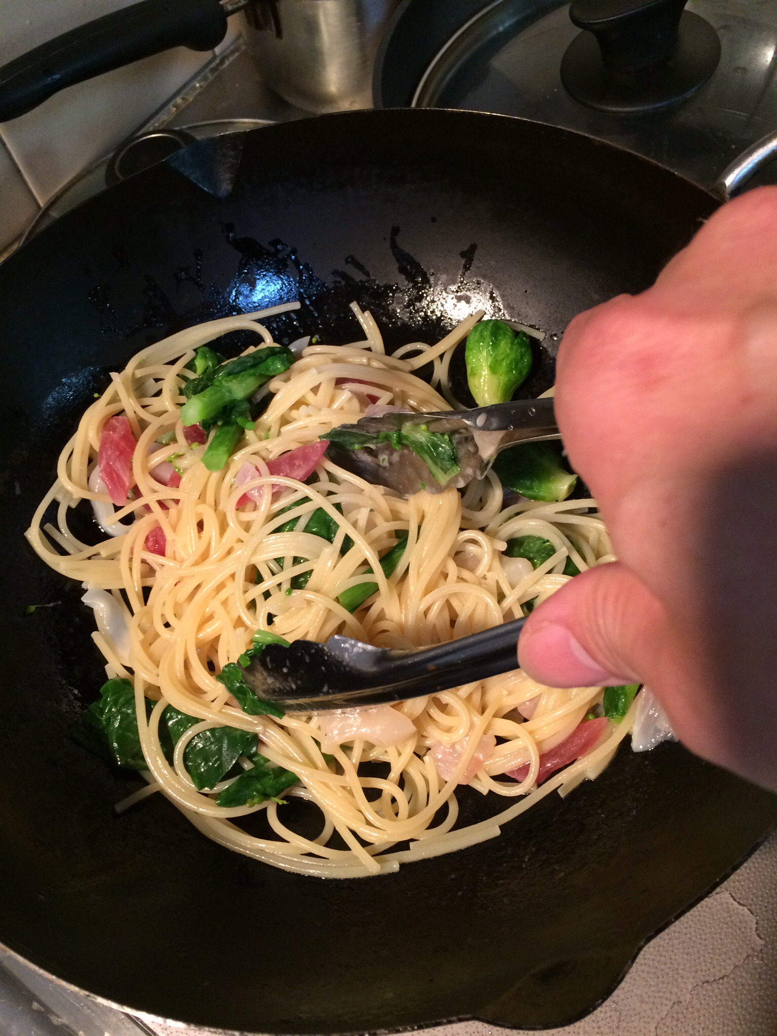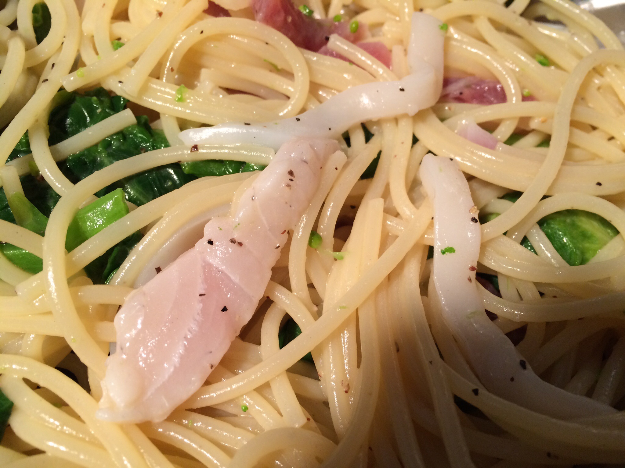 トングで和えてイカが麺と野菜の余熱で白くなってきたら完成です。