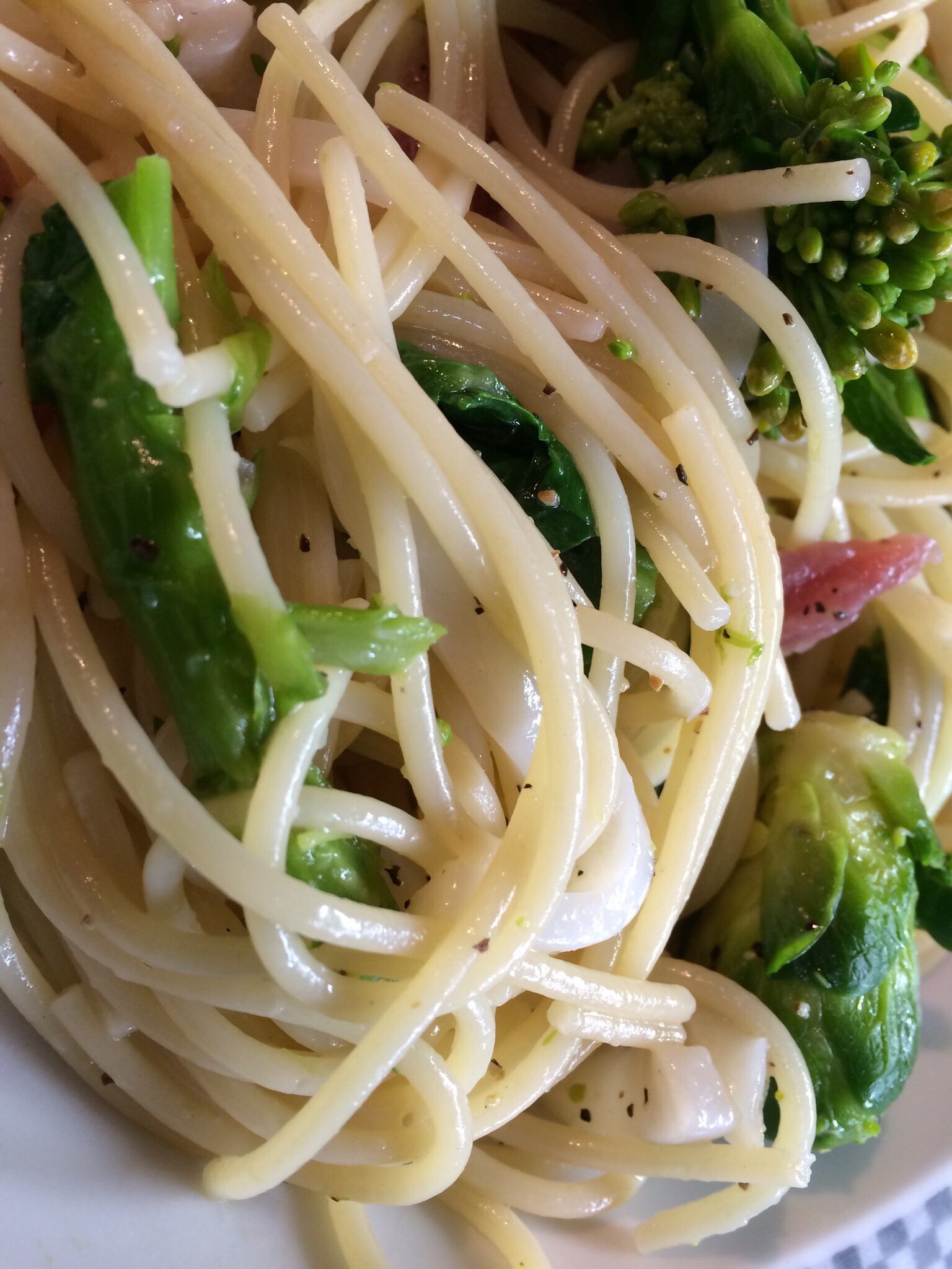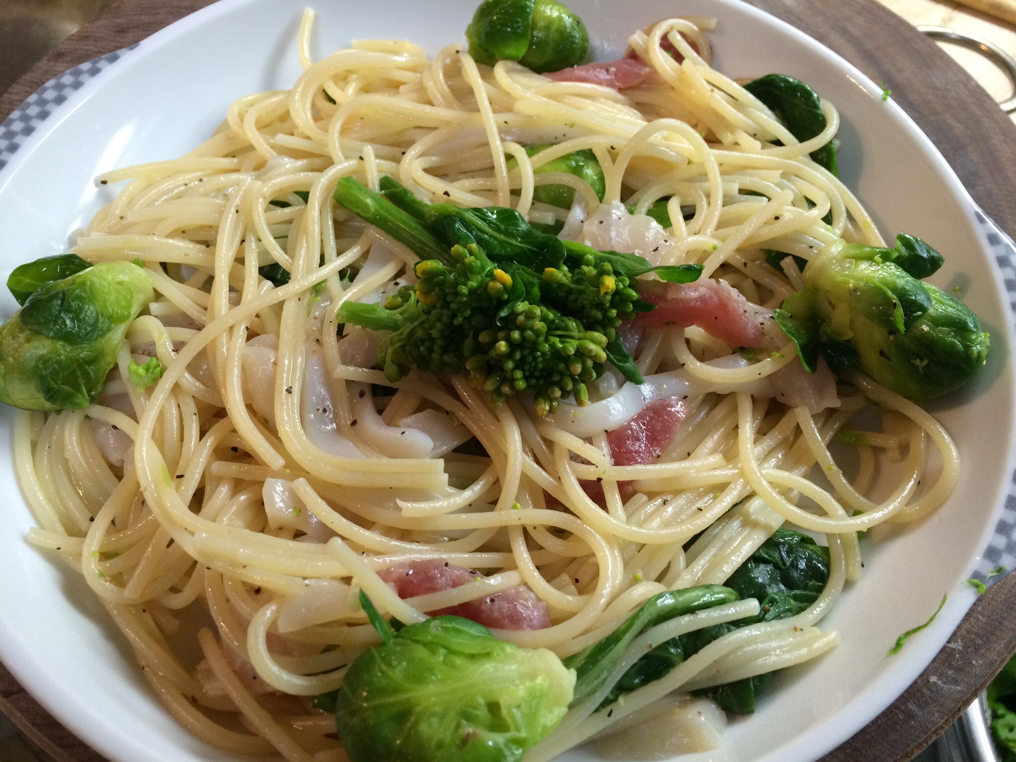 別々に野菜とパスタを茹でますが、同時に茹で上がるように段取ります。