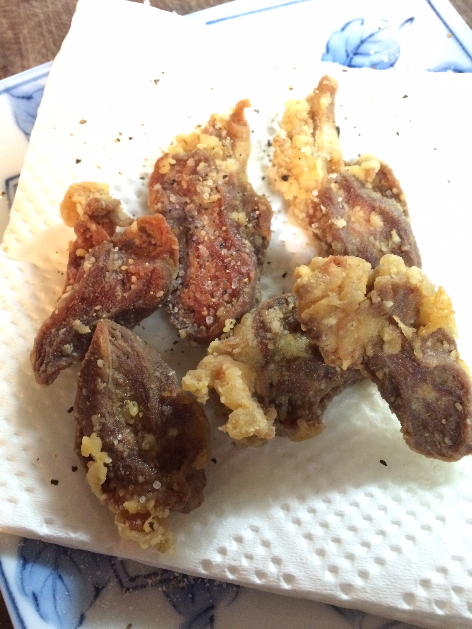 油がもったいないので「オマケ」に鳥のハツを開いて揚げて塩コショウ。