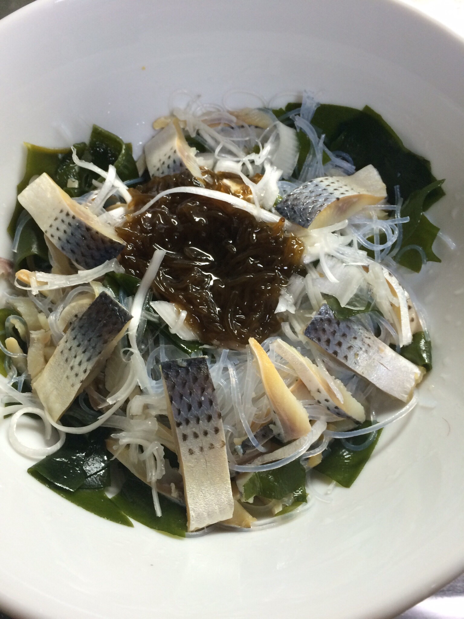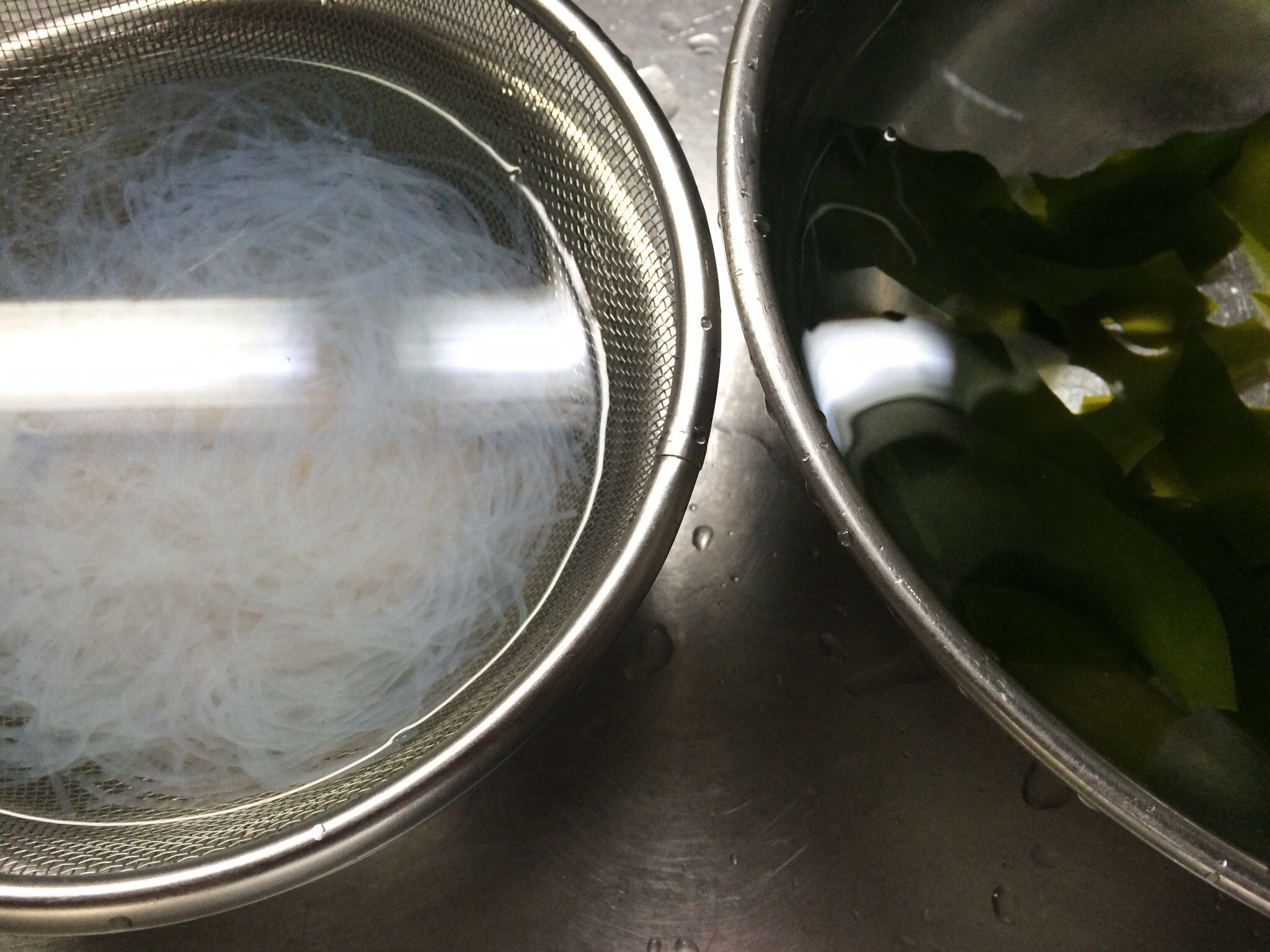 サラダ用春雨30gを熱湯で、ワカメをお水で戻します。