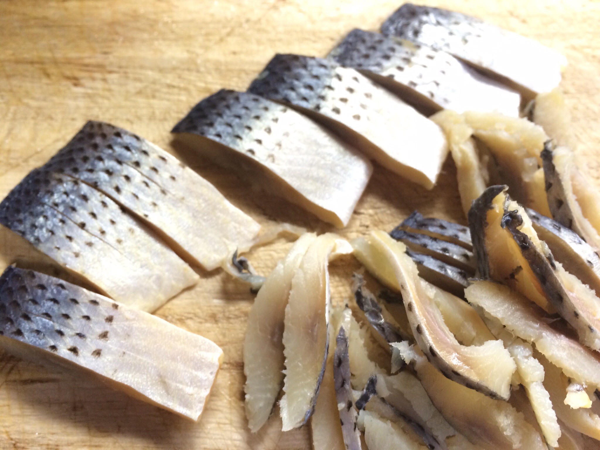 買い置きの小肌の酢漬けを、混ぜるのは細切り、、飾り用は少し大きめにカット。