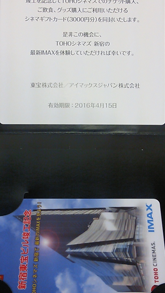 竣工記念にTOHOシネマギフトカードを頂きました。