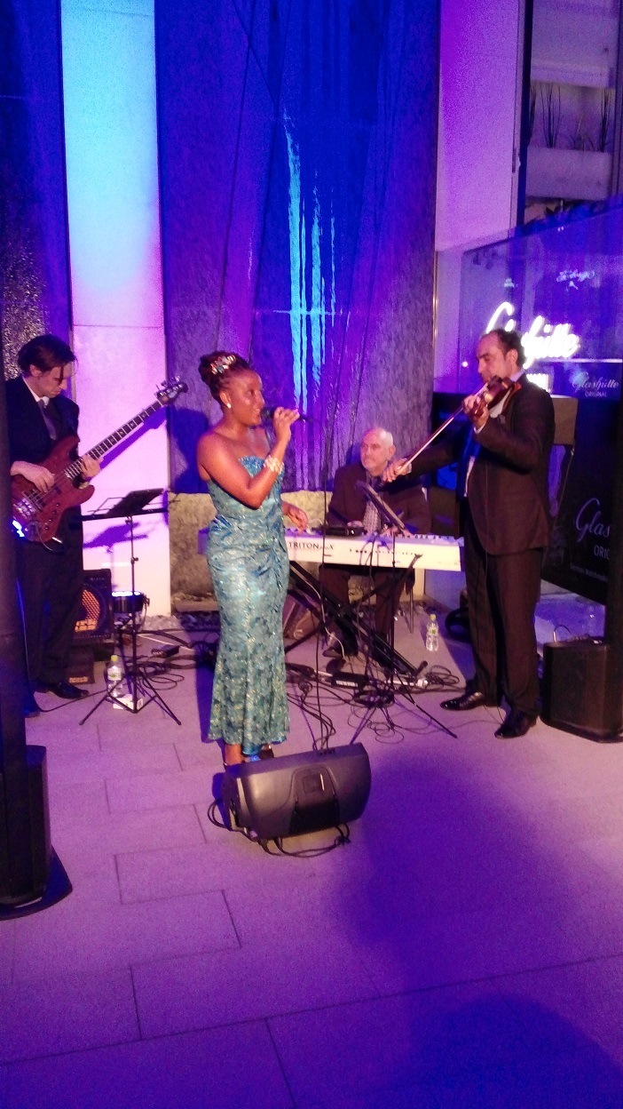 まず、1階のエントランスにいくと、照明が全てブルーになっていて、ジャズの生演奏が聞こえています。