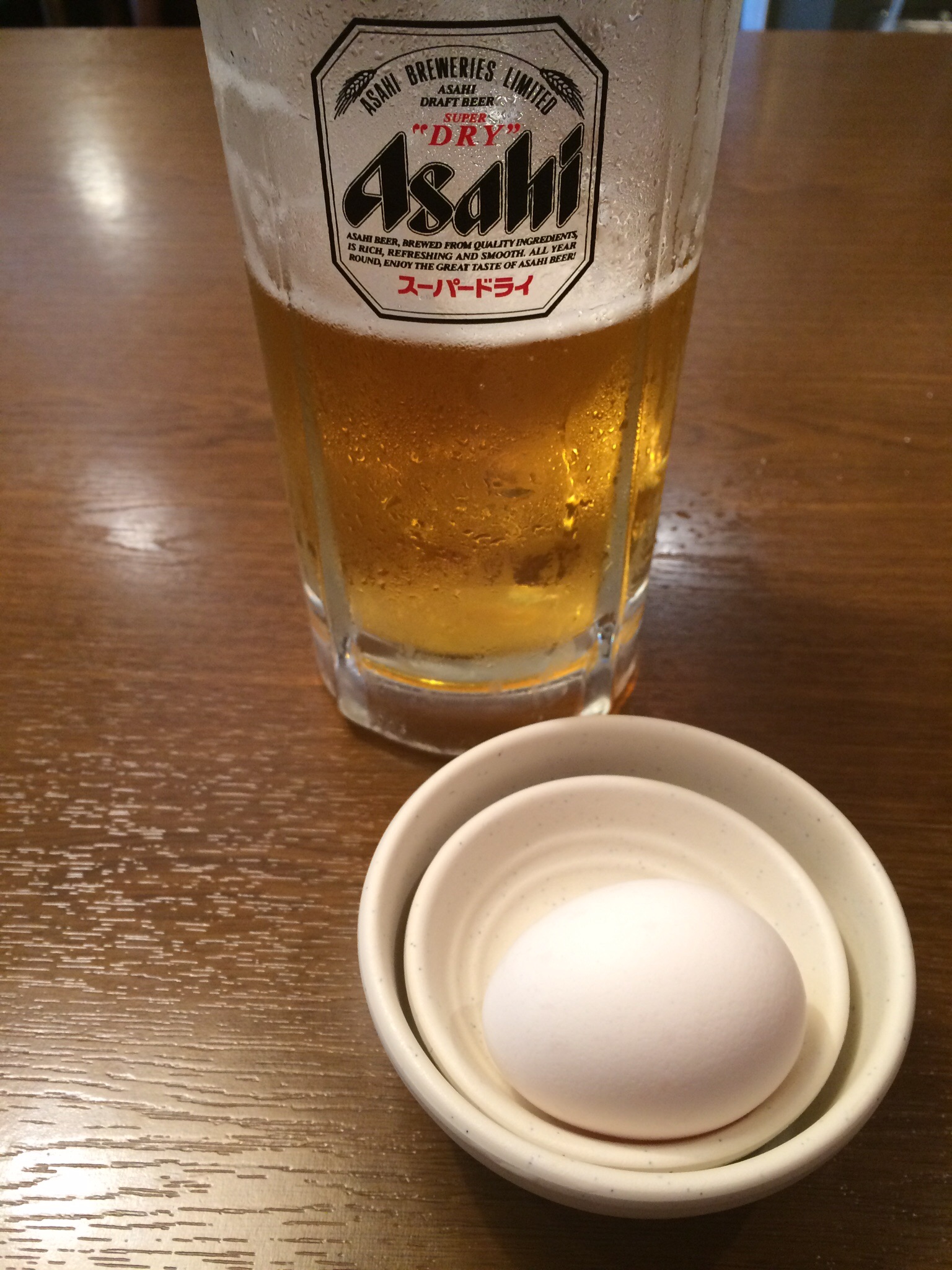 無料サービスの生卵を一つ確保して、まなビール。