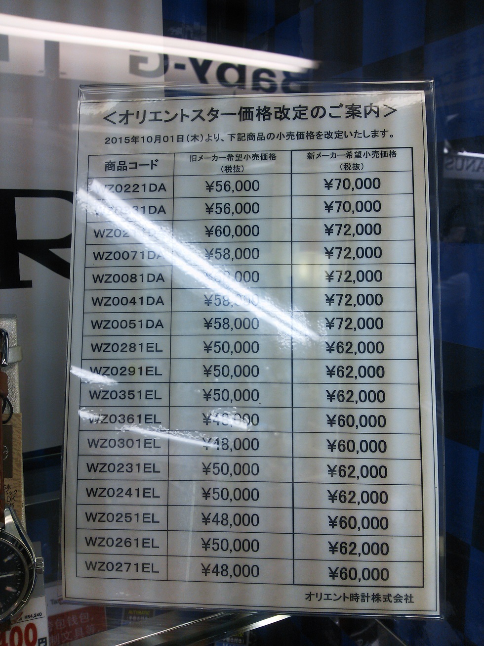 オリエントも10/1より値上げとなります。