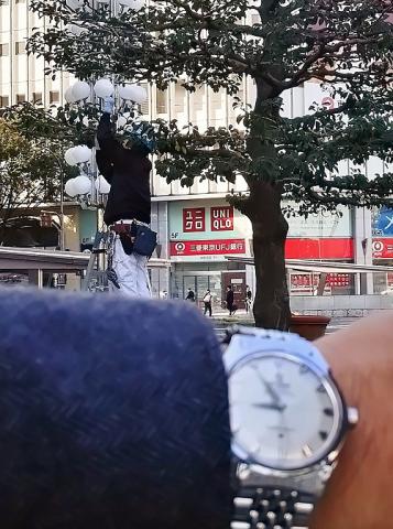 出勤途中に名古屋栄の大通り、ライトアップの準備に出くわしました。