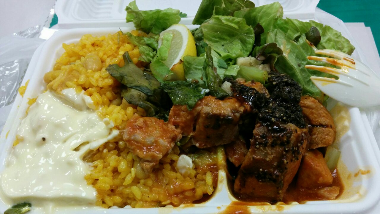 今日のランチは移動販売で鶏肉のパエリャと豚肉のバスク風煮込み。