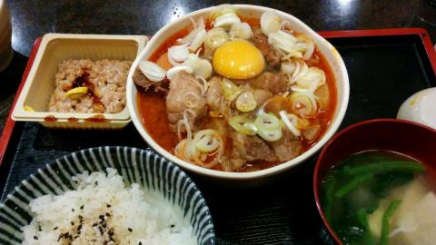 牛すじ煮込みランチ。生卵食べ放題。12時前は納豆も