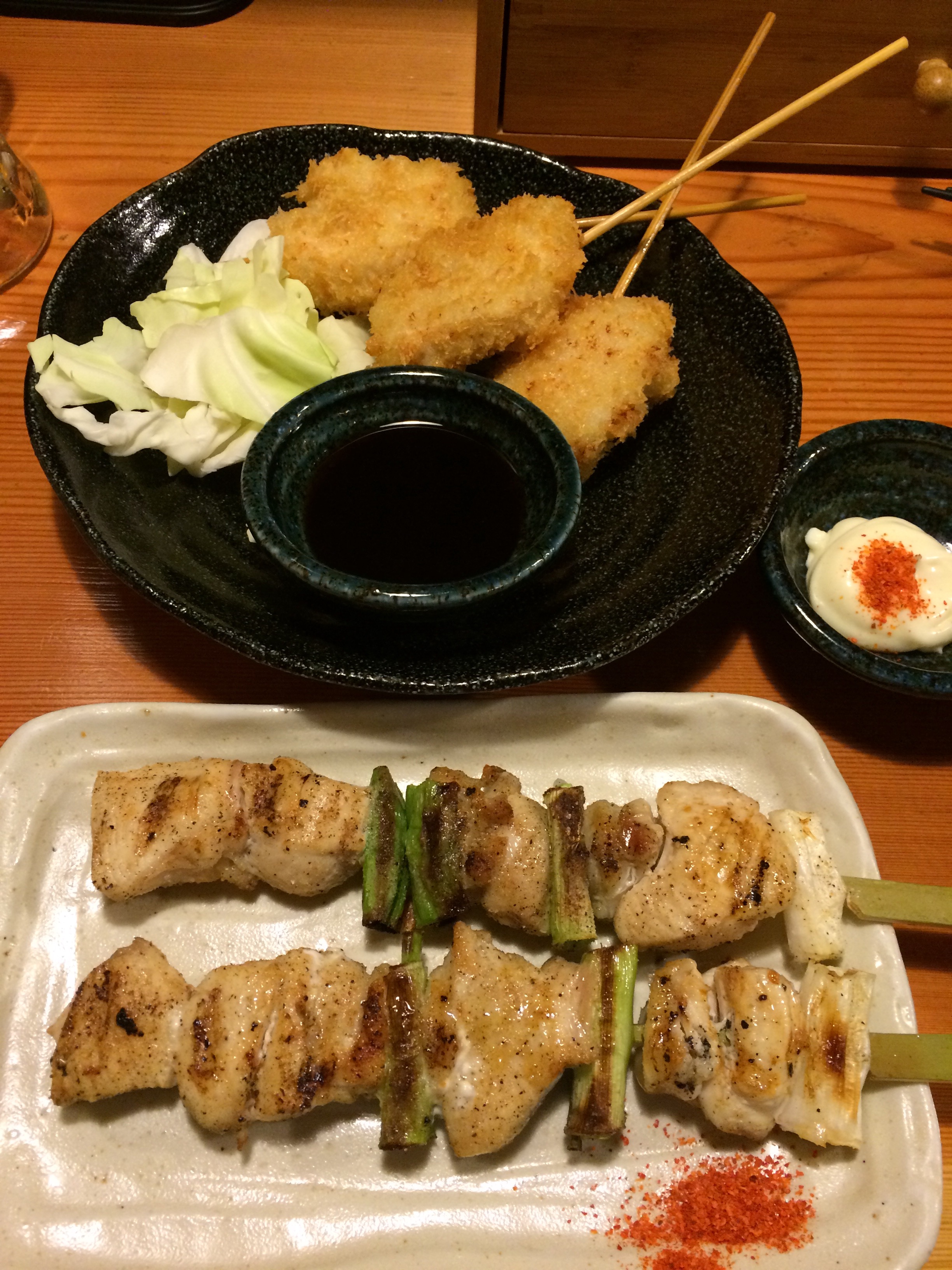 鶏胸肉の串カツにスパイス風味の串焼き。