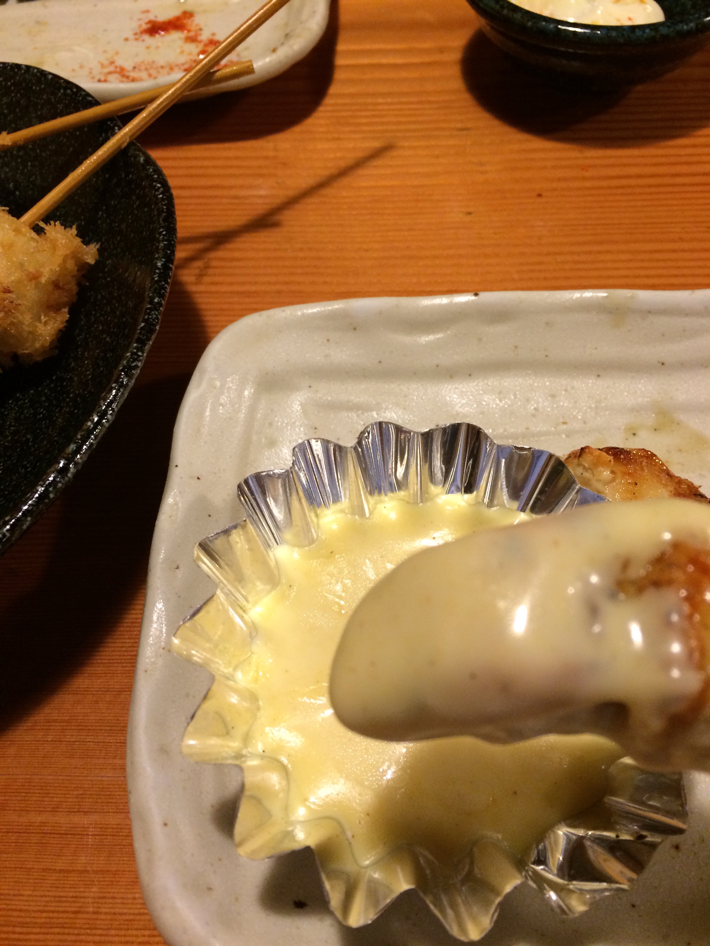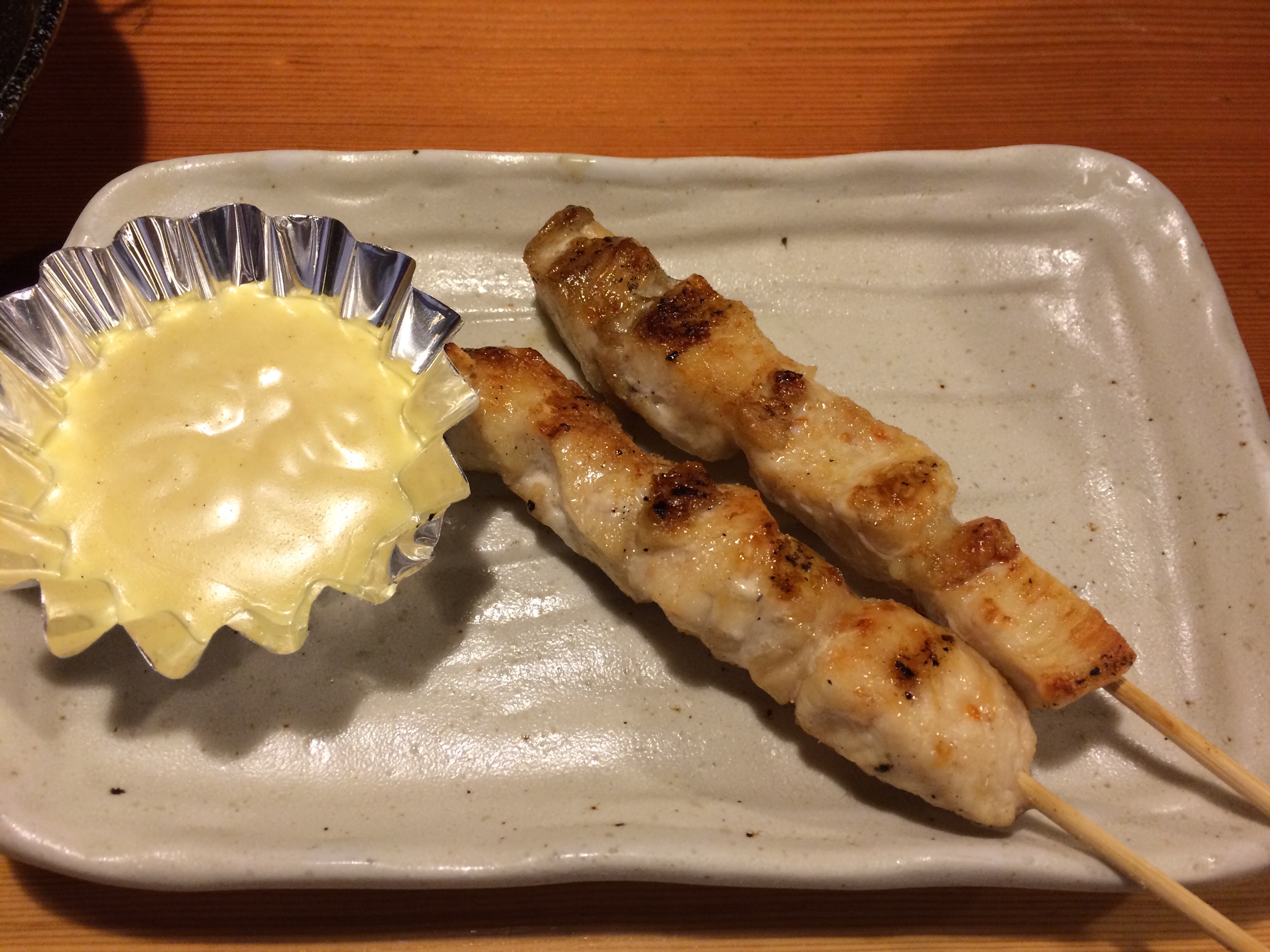 新メニュー「胸肉のチーズフォンデュ串」」発見。