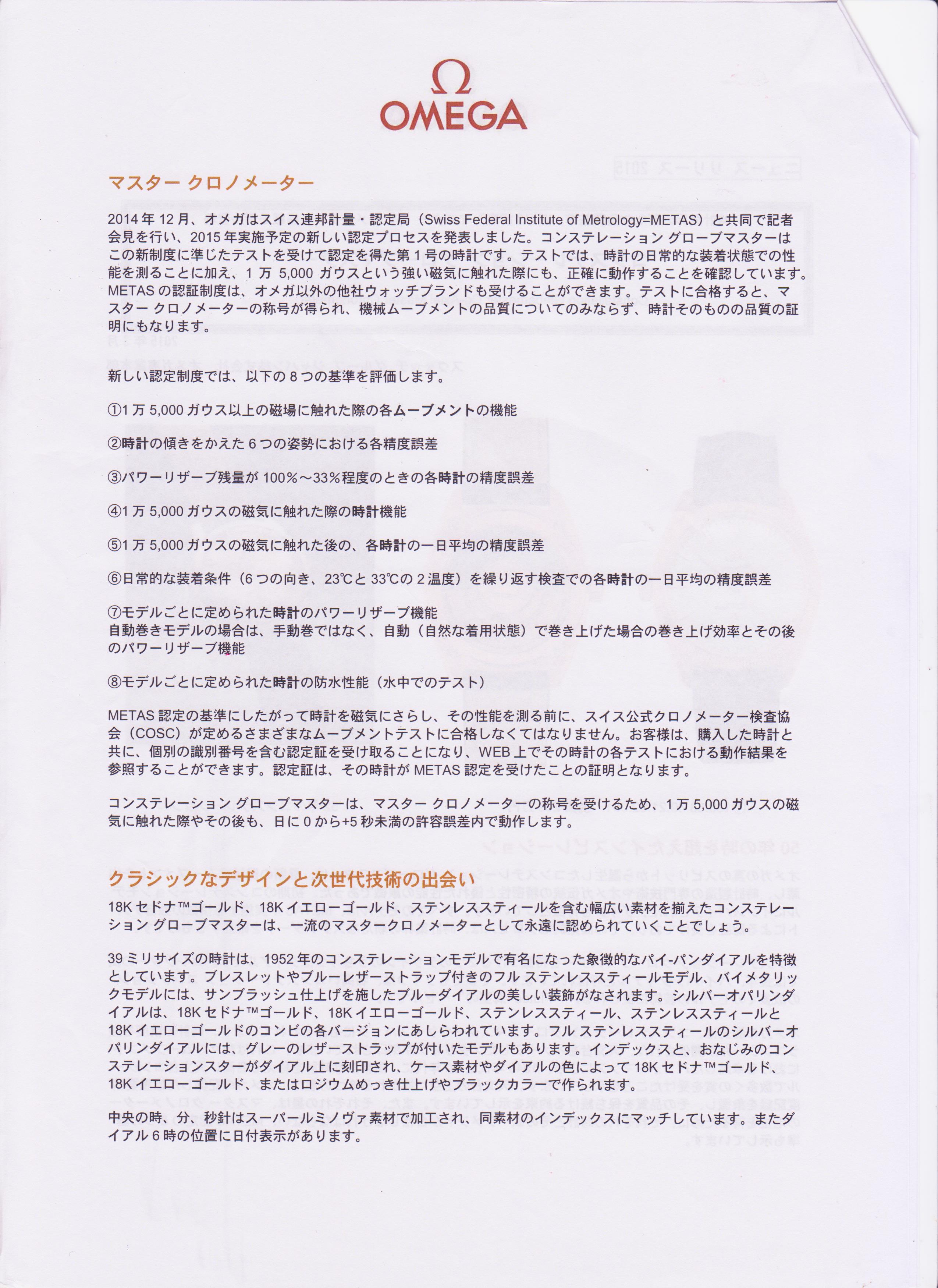 モデルごとに定められたパワーリザーブと防水性能テストという過酷なものです。そこまでやって日差0秒から+5秒でないと認定されません。オメガはセキュリティを理由に社内施設にメタスの検査場をもうけましたが、当然OPENな検査機関の為、他社のテストも受け入れるそうです。用はこの条件をクリアできるものならやってみな!という強気な表れでしょうか。オメガはほぼ全ての時計がこの基準をクリアできる自信があるそうです。(実際は厳しかったのか生産数が伸びてきませんが。) http://www.webchronos.net/sns/?m=pc&a=page_fh_album_image... http://www.webchronos.net/sns/?m=pc&a=page_fh_album_image... http://www.webchronos.net/sns/?m=pc&a=page_fh_album_image... http://www.webchronos.net/sns/?m=pc&a=page_fh_album_image... http://www.webchronos.net/sns/?m=pc&a=page_fh_album_image...