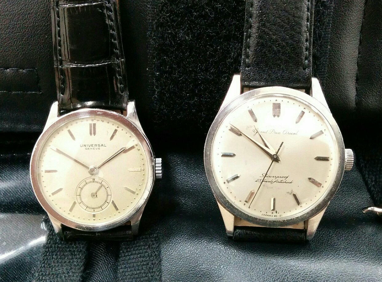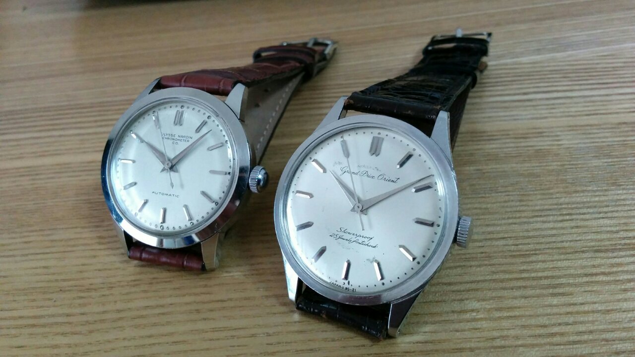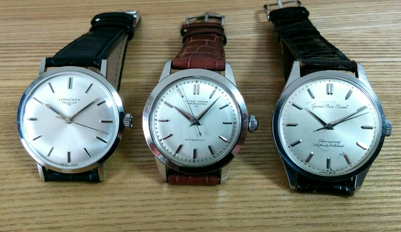 ロンジンとナルダンはベゼルが傾斜したタイプですがユニバーサルとオリエントは