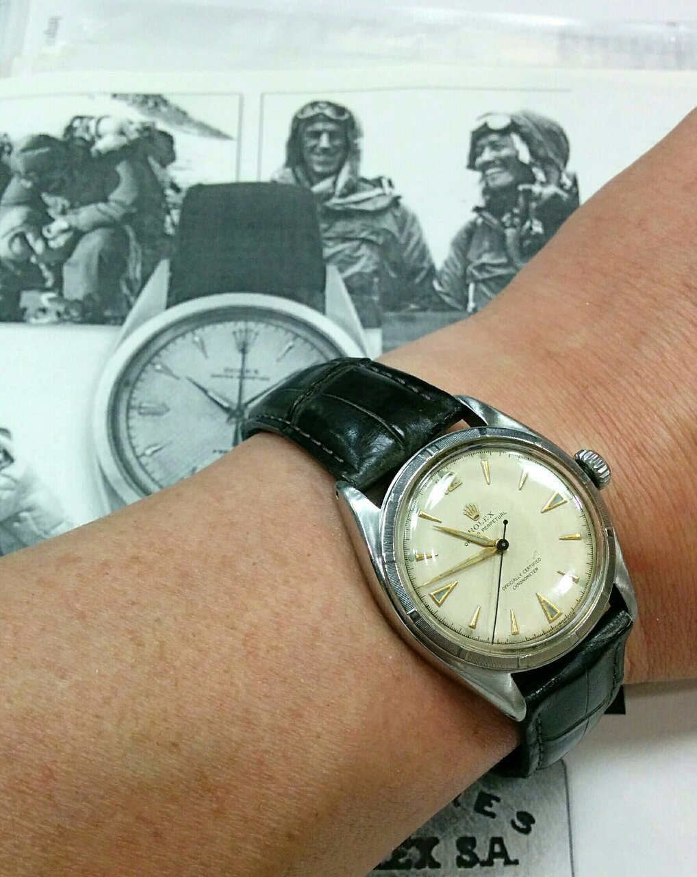 ロレックスをつけていたとの事です。 その後ロレックスはヒラリー卿にロレックスをプレゼントしておりそのモデルはこのセミバブルバックの1953年製6084であったようです。 アンテイコラムのオークションに出品され明らかになりました。