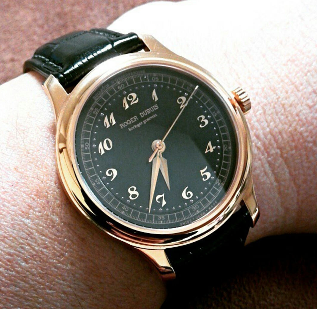 先日、彼女と会いました時に、ロジェの黒金のオマージュクロノを着けてました。