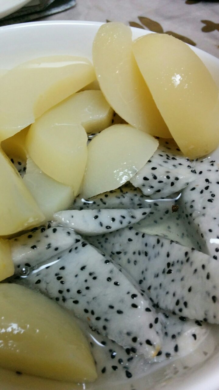 今晩のデザートはドラゴンフルーツ。見た目のインパクトより上品な甘さ。でも日本に来てるのは完熟してないのがほとんどらしく味がしない。仕方ないので桃缶開けて一緒に食べました。