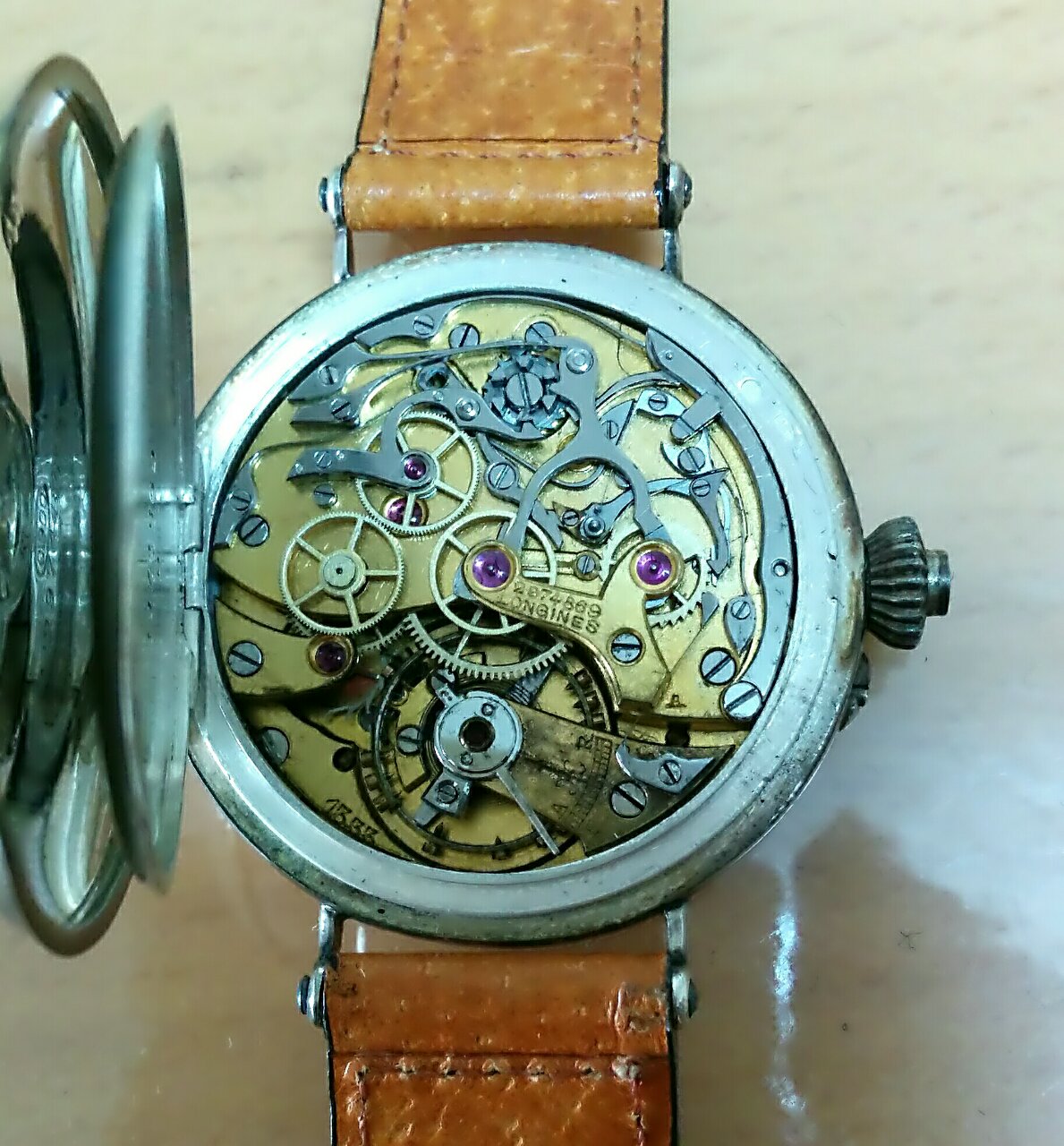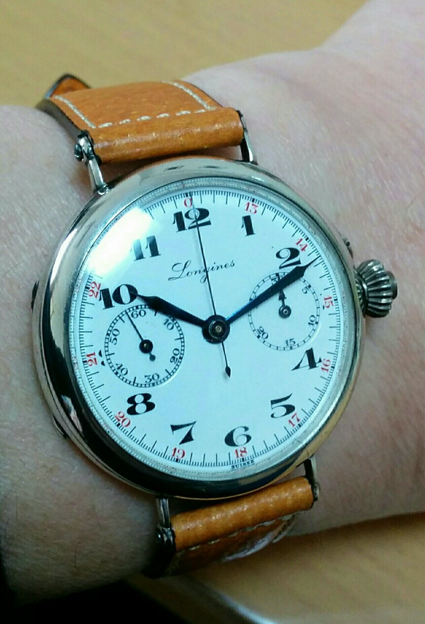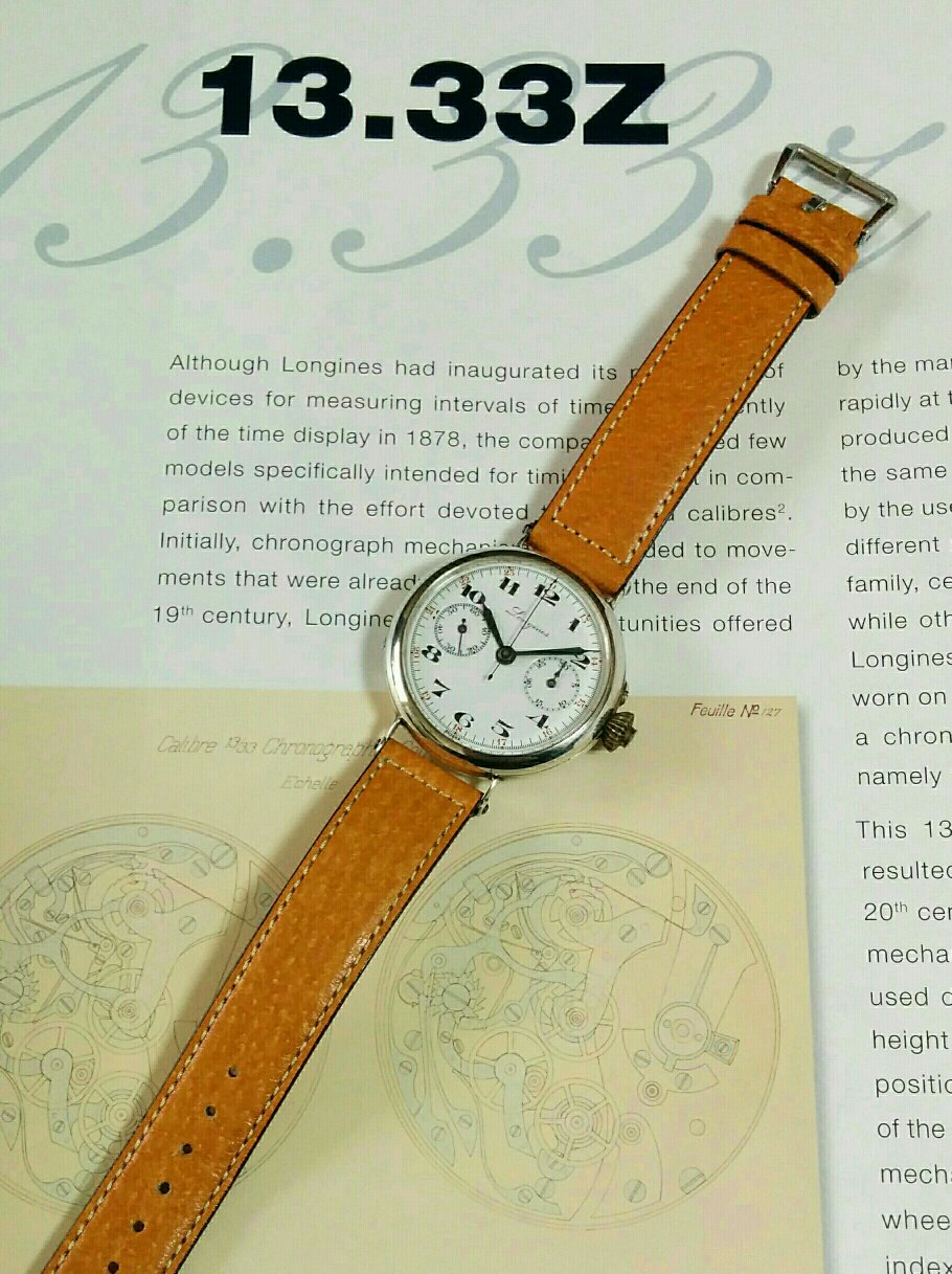 ロンジンの初期のクロノグラフ13.33を搭載しシルバーケース。ポーセリンダイヤルなのでダイヤルは綺麗です。