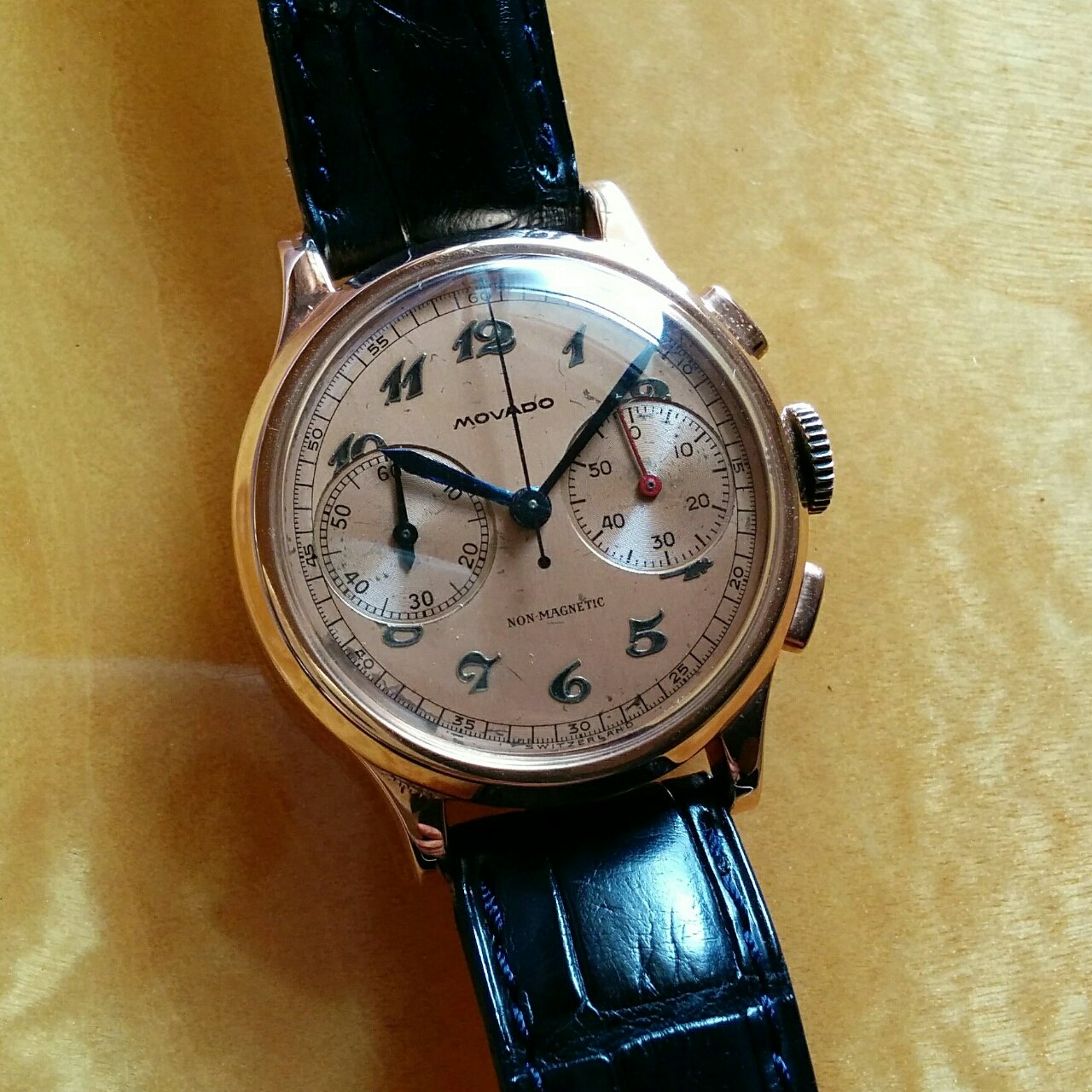 モバードのクロノグラフ。ピンクダイヤルかつケースもピンクゴールド製で小さいですが存在感はあります。モバードのブレゲ数字のフォントは可愛いのです。