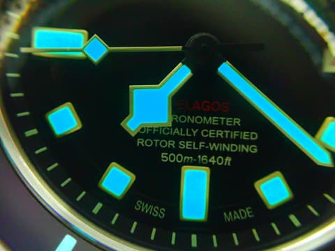 実はお店の方から、「PELAGOSはベゼルまで夜光が入っていて、金庫にしまう時、よく光るんですよ」とのお話がありました。