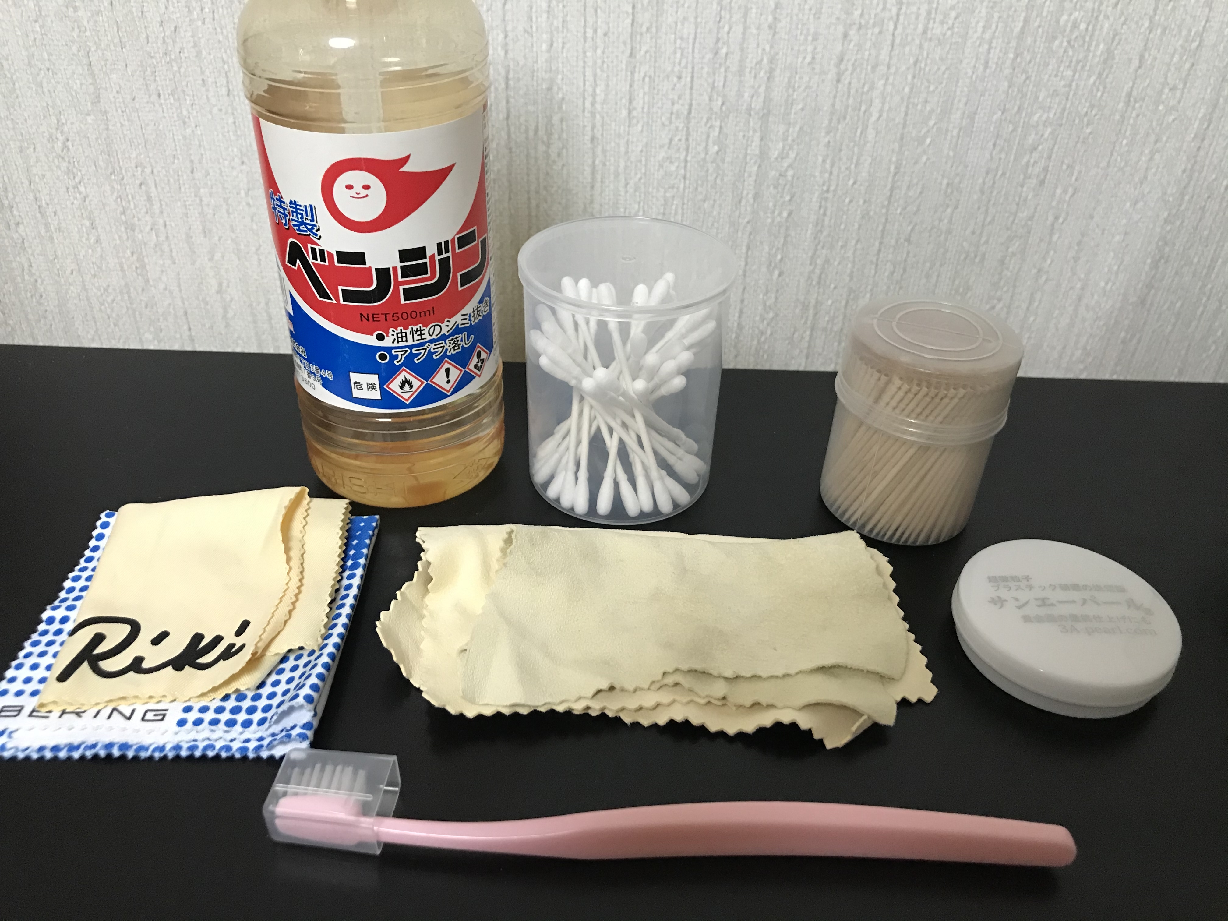 左奥から、ベンジン、綿棒、爪楊枝、手前左から、マイクロファイバークロス、セーム革、サンエーパール、そして歯ブラシです。