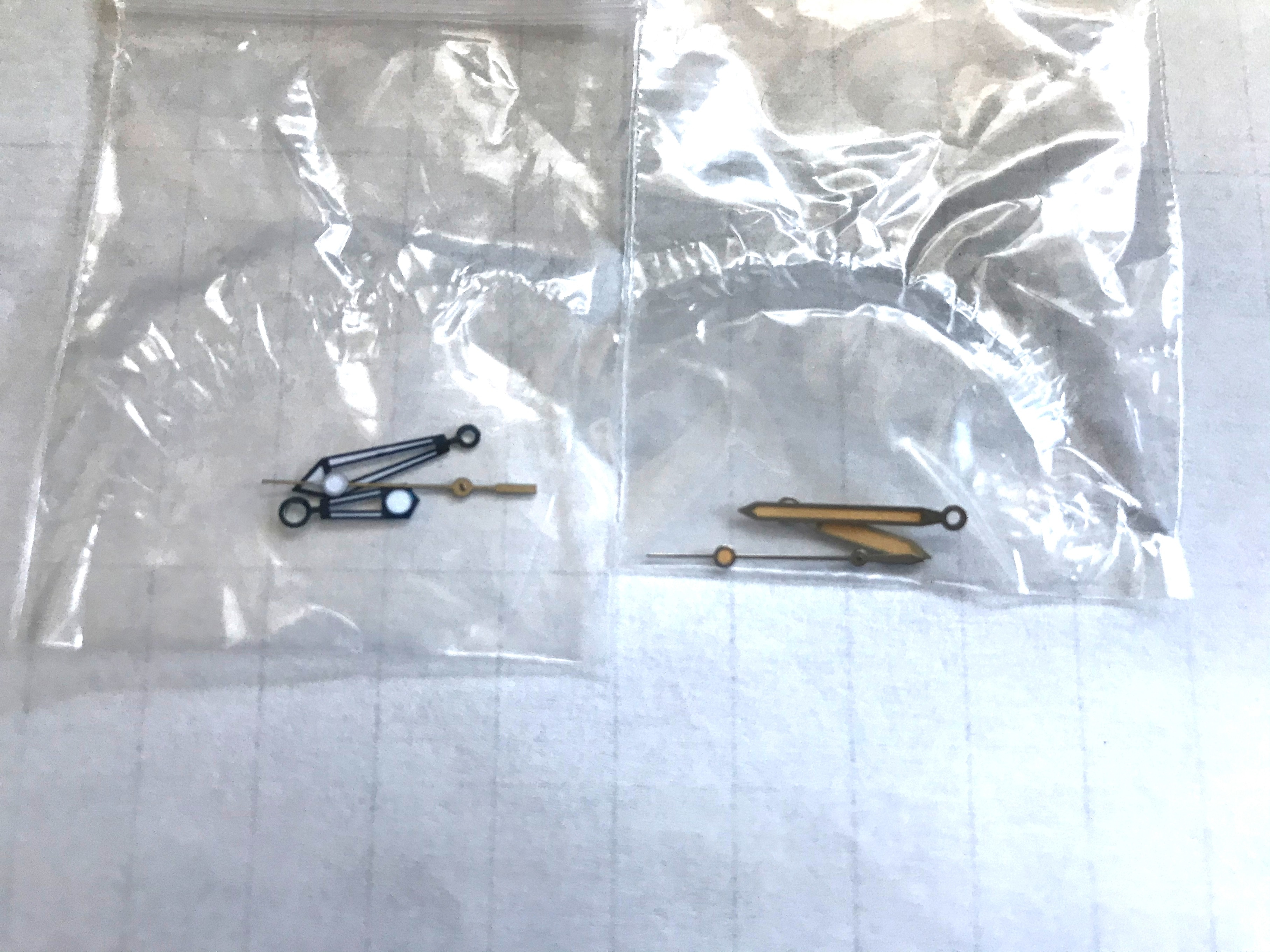 これは夏をイメージしたスポーツウォッチに使う予定で、時分針を左のブルーの物、秒針を右のオレンジサークルの付いた物にしようと思っています。写真では分かり難いですが、ブルーの針の発色が思った以上に綺麗だったので満足しています。