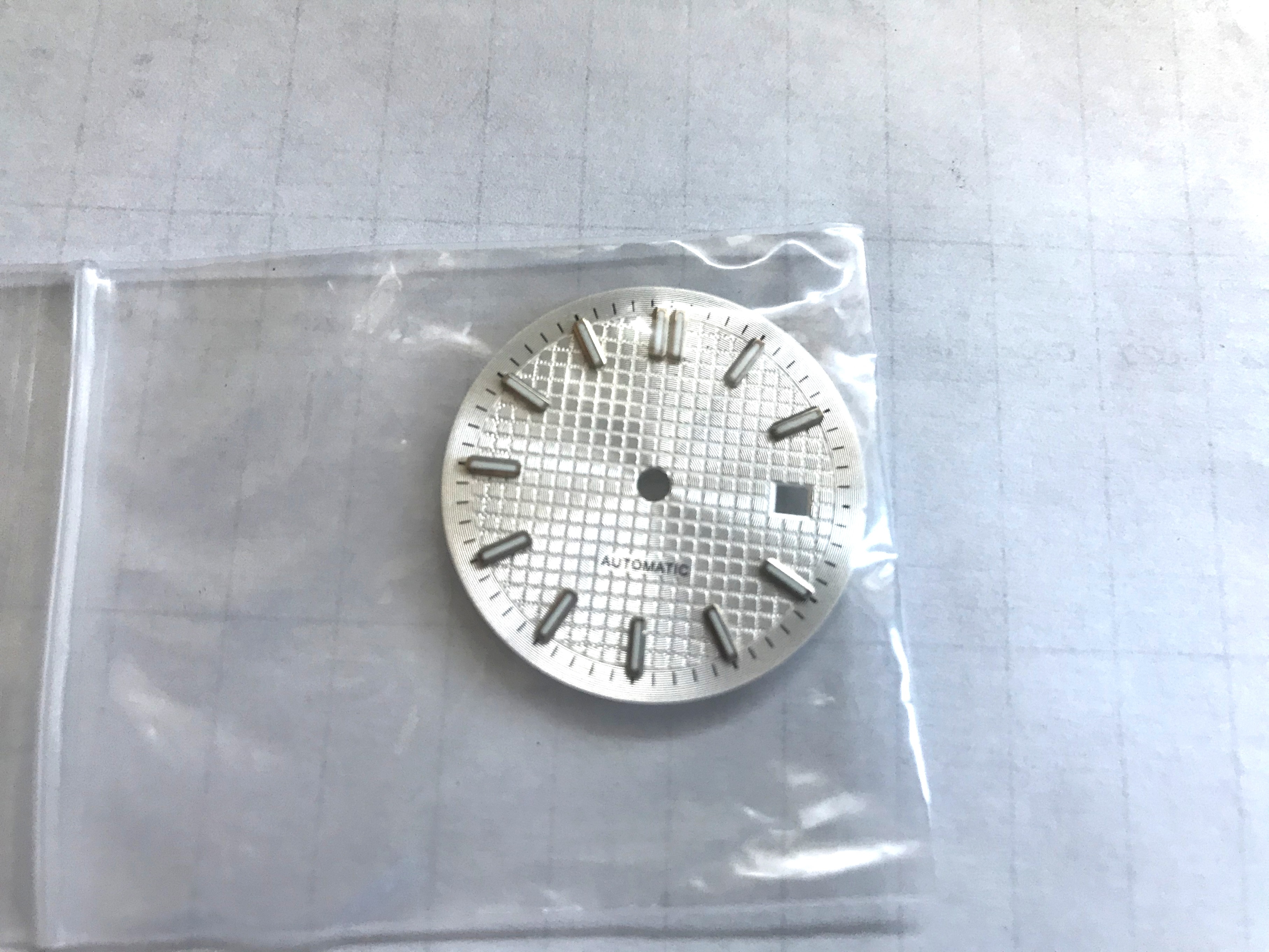 プレス成形だと思うのですが、表面に細かい模様が入っていて、立体感もあり、とても良く出来ています。この文字盤を使った時計は、ジャンルで言うとインフォーマルウォッチにしようと考えているのですが、針、ケースなどは未だ検討中です。シンプルな雰囲気の、様々な種類のストラップに合わせられる時計を目指して他のパーツを探しています。