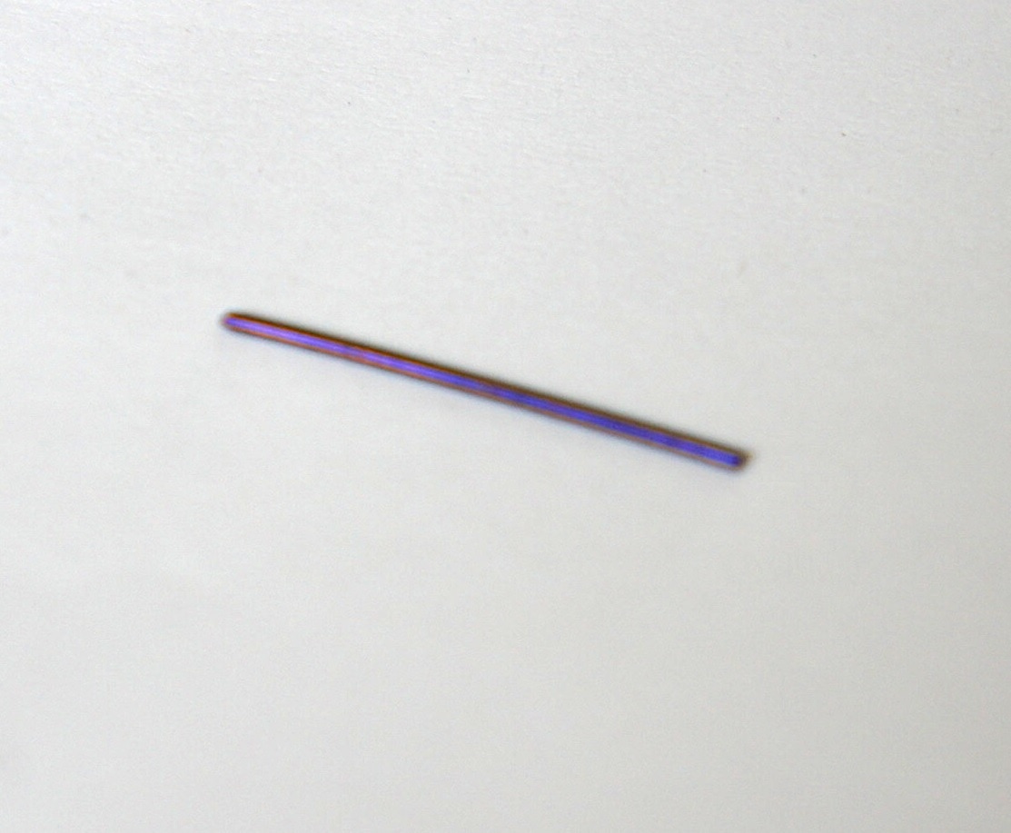 この針が出来た時は、色の変わり始めに火から下ろし、予熱でブラウンとバイオレットの中間にしてから、再度少しずつ火に掛けていって色を調節しました。まさかこんなに上手く行くとは思っていなかったので、温度が下がって色が確定した時は本当に驚きました。