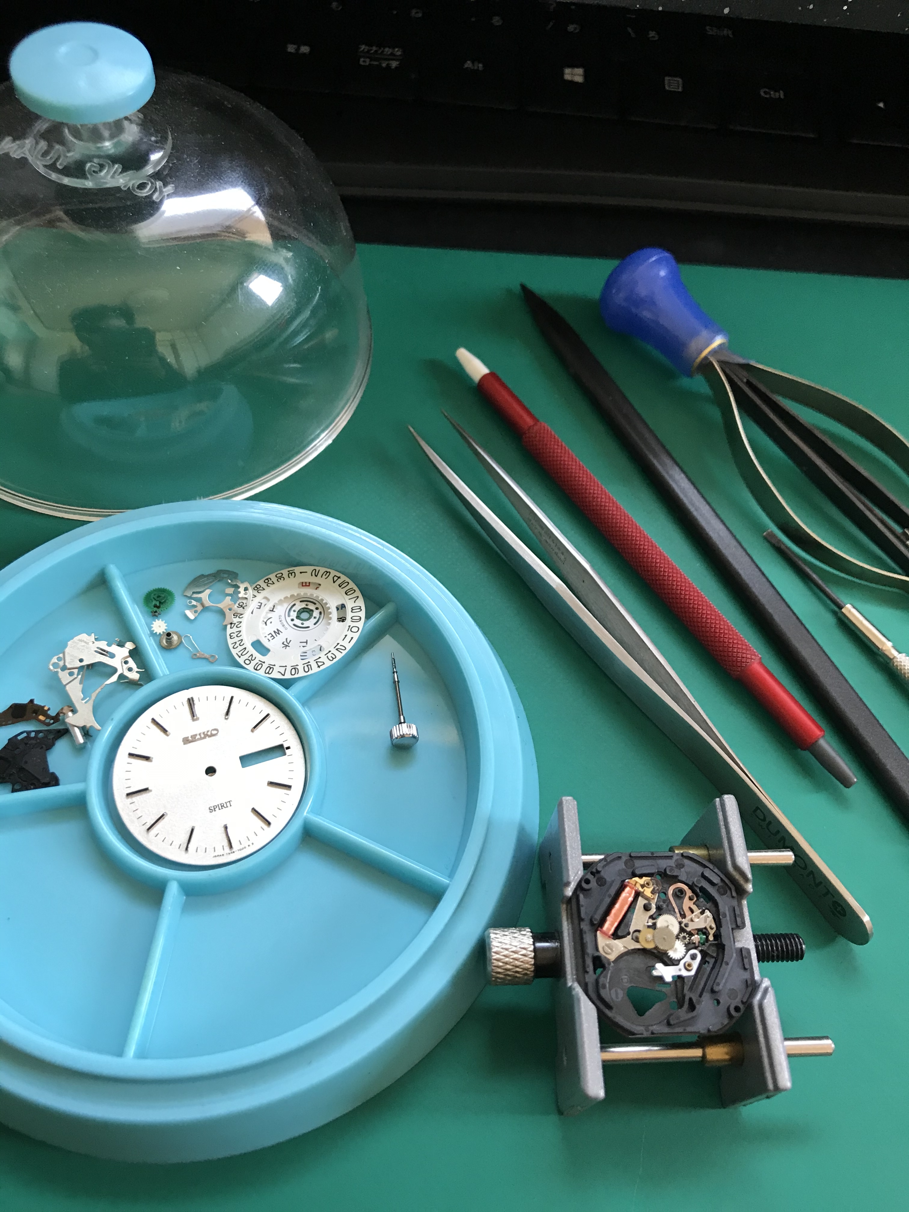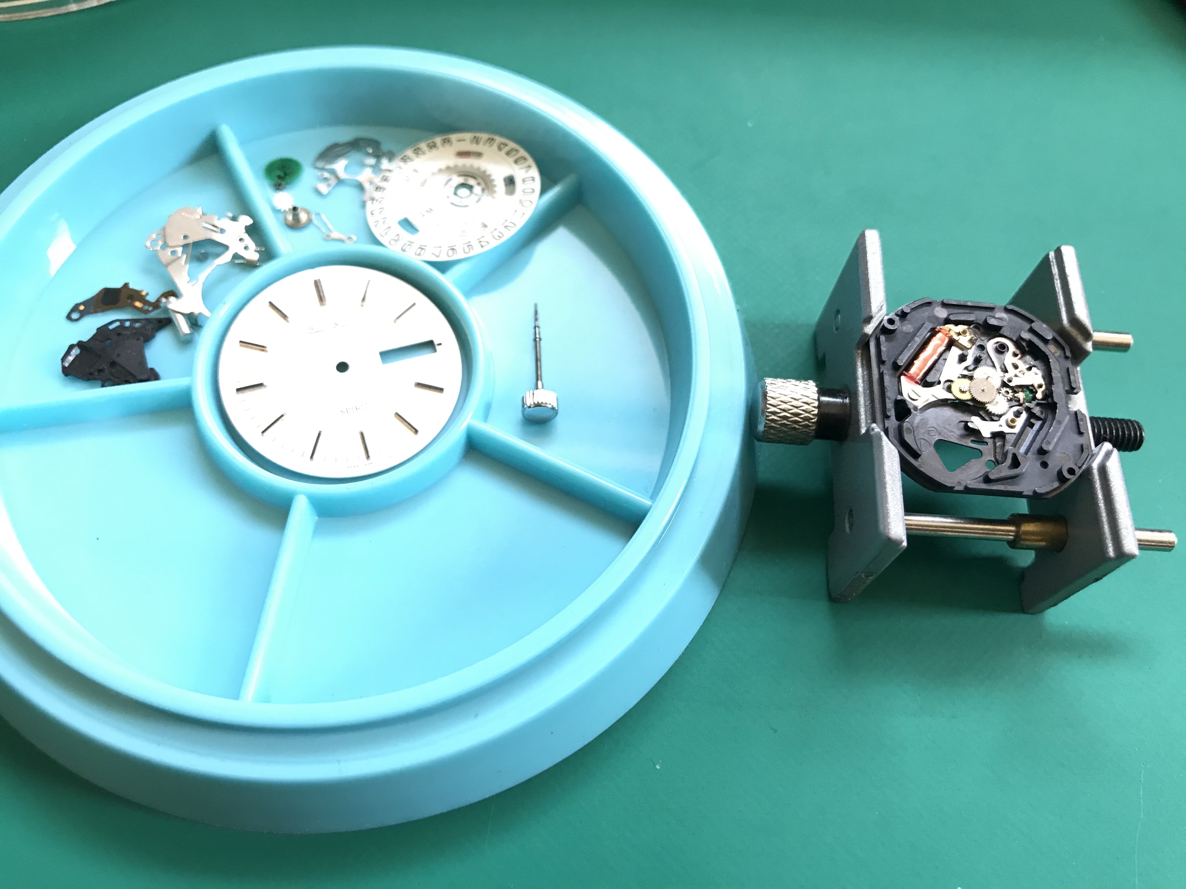 ムーブメントの分解はドライバーとピンセットがあれば、大抵の方は出来ると思います。しかし、組立にはコツと技術が必要です。特に難しいのは輪列受けを取り付ける時で、全ての輪列のほぞが正確に受けに入る様にしなければなりません。そして、7N43はデイデイトのムーブメントで、日付ディスクと曜日ディスクが正しく動く様に取り付けるのにも苦労しました。