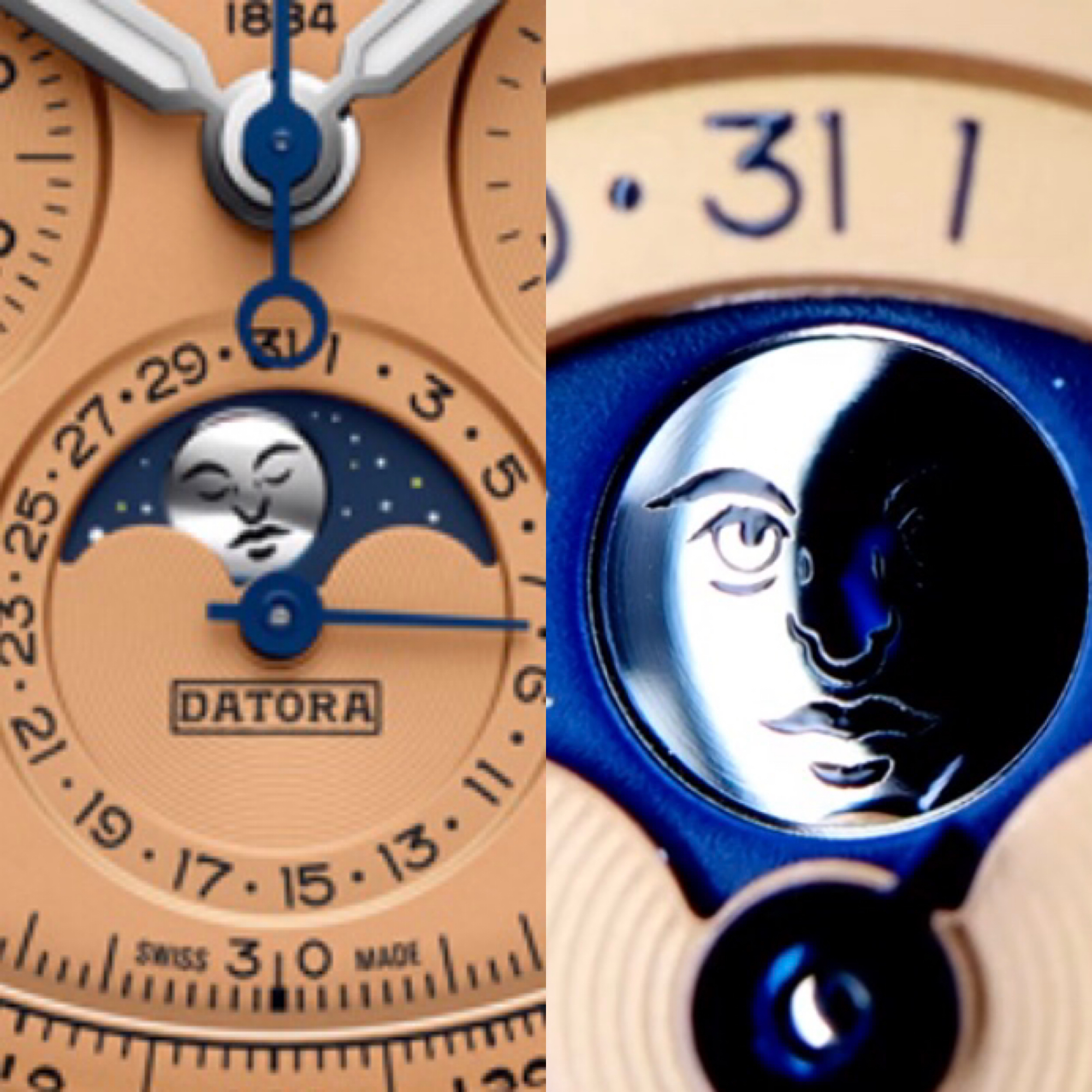 お月様と日付けは、リューズ操作で、曜日はサイドのボタンとなってます。