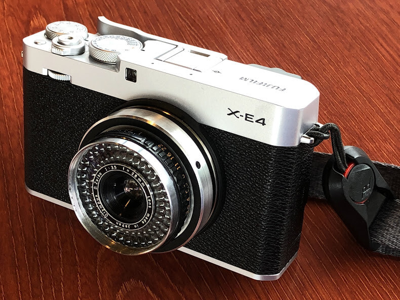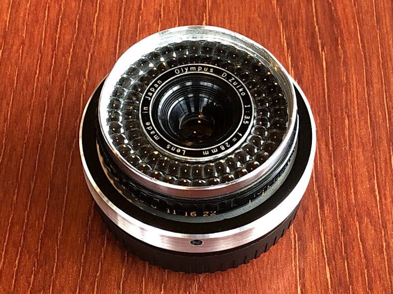 で、今回入手したのはオリンパス・ペンEEあたりから改造されたD.Zuiko 28mm/f3.5レンズである。