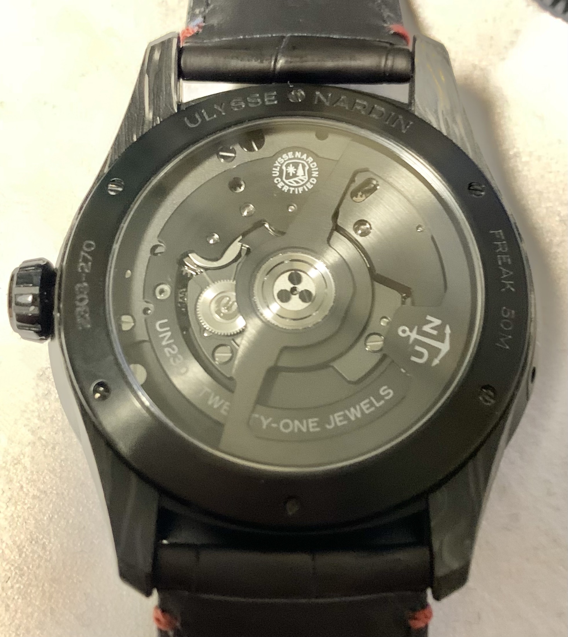 さて本題に入ろうと思いますが、今回はマリンクロノメーターや天文三部作などで有名なルロックルの老舗メーカーユリスナルダンよりフリークX(Ref.2303-270/Carb)をご紹介したいと思います。